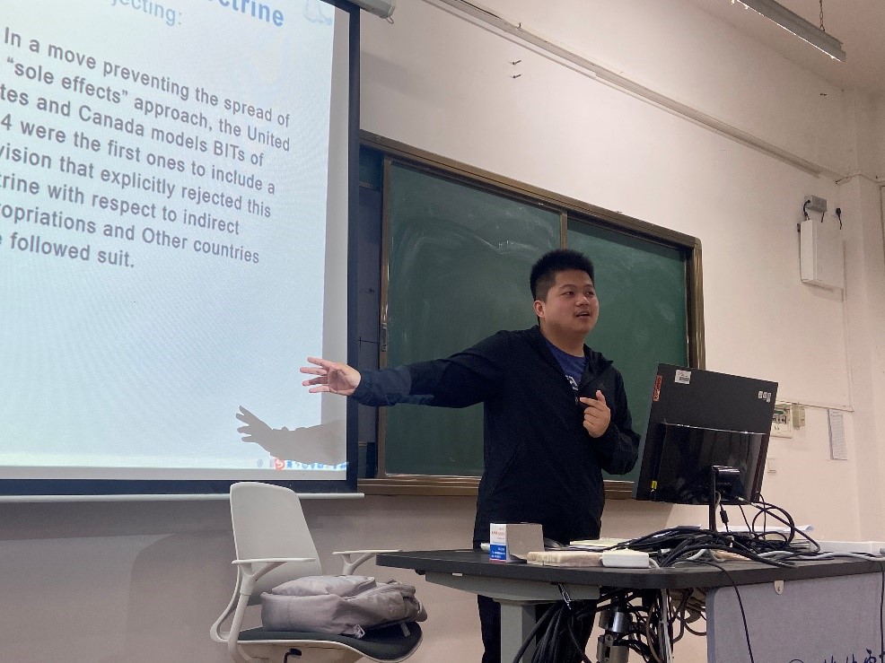 赵玉意老师采用了导学的教学方式,对国际投资法的征收问题进行讲解,赵老师主要讲解了直接征收、非法征收等知识点,逻辑缜密的讲解过程引发了同学们的思考,加深了对知识的理解。苗凯同学作为同学代表,制作了PPT,对间接征收的认定等问题进行讲解。
