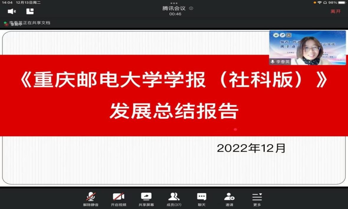 2022年12月13日下午14:00,法学院/知识产权学院与《重庆邮电大学学报(社会科学版)》举行了“云”交流会议。参会人员主要有,《重庆邮电大学学报(社会科学版)》李春英主任,学报编辑刁胜先教授,三亿官方官网三亿(中国)_三亿(中国)法学院/知识产权学院院长高兰英教授,系主任祝高峰副教授以及学报、学院部分教师及研究生。会议首先由李春英主任讲述了学报的发展历程、编委会介绍以及获得的一系列成果。