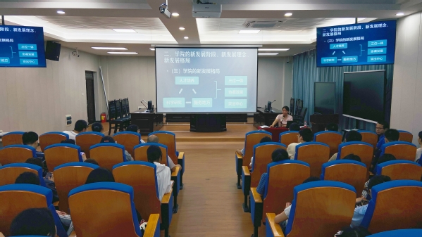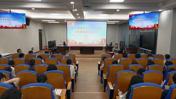 6月9日下午,法学院党委书记吴耀光以“学习贯彻党的二十大精神,培养高素质法治人才”为主题,院长高兰英围绕“把握新发展阶段,贯彻新发展理念,构建新发展格局,推动学院高质量发展”主题分别在花江校区四创中心1号楼法学院109(模拟法庭)为师生党员讲授主题教育专题党课。学院师生党员近100人参加。
