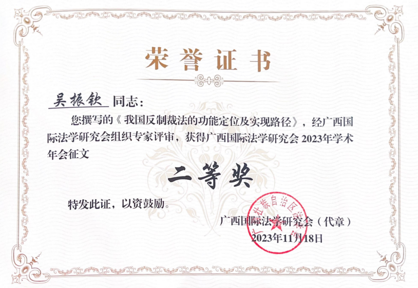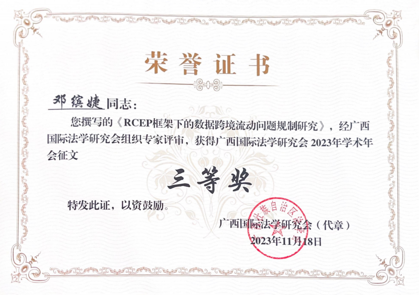 本次年会共计收到80余篇论文,经专家评审,共评选出一等奖3篇,二等奖8篇,三等奖14篇。其中三亿官方官网三亿(中国)_三亿(中国)法学院22级研究生吴振钦撰写的《我国反制裁法的功能定位及实现路径》一文在本次年会征文中荣获二等奖,22级研究生邓缤婕撰写的《RCEP框架下的数据跨境流动问题规制研究》一文在本次年会征文中荣获三等奖。