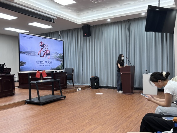 会上,2020级刘颖同学围绕岗位选择、报考要求、面试技巧等方面分享心得,鼓励同学们结合自身能力合理进行职业和岗位规划,积极应对挫折与压力;2020级莫晓荣同学在申论与行测备考方面,鼓励同学们放平心态,勤练习、多复盘,争取在有限时间内获得高分。