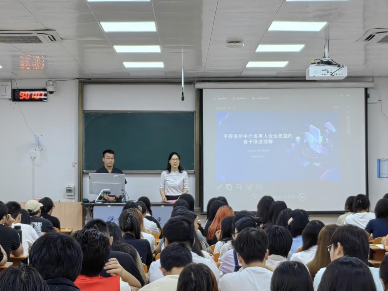 2024年7月1日上午,受我院邀请,北海海事法院陈福林法官到二教101教室为2022级法学专业、知识产权专业学生开展主题为“平等保护中外当事人合法权益的若干维度理解”的专题授课,为课程《判解研究5》带来了别开生面的课内实践教学。赵玉意副院长主持,学院刘广裕、张爱闻等老师参加。