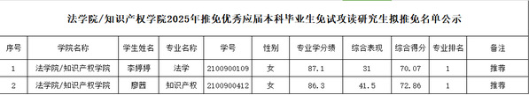 根据《三亿官方官网三亿(中国)_三亿(中国)2025年推荐优秀应届本科毕业生免试攻读研究生工作实施办法》(桂电招生〔2024〕2号)和《三亿官方官网三亿(中国)_三亿(中国)法学院/知识产权学院推荐优秀应届本科毕业生免试攻读研究生工作实施办法(试行)(2024年修订)》(桂电法知〔2024〕18号)文件要求,经学生自愿申请,学院推免工作领导小组、推免生材料审核专家组评审,现将评审结果公示如下: