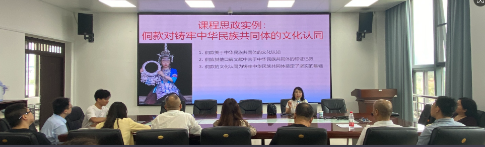 袁翔珠分享的主题是“铸牢中华民族共同体课程思政”,她表示:“在当前全球化背景下,民族认同和文化自信显得尤为重要。在教学过程中要将铸牢中华民族共同体的意识与自己的课案相结合,这样才能让学生在学习本专业知识的基础上培养自己的民族意识。袁老师以“侗款”为例,生动形象地向全体老师展示了如何将思政以润雨细无声的方式传授给学生,从而取得良好的教学效果。