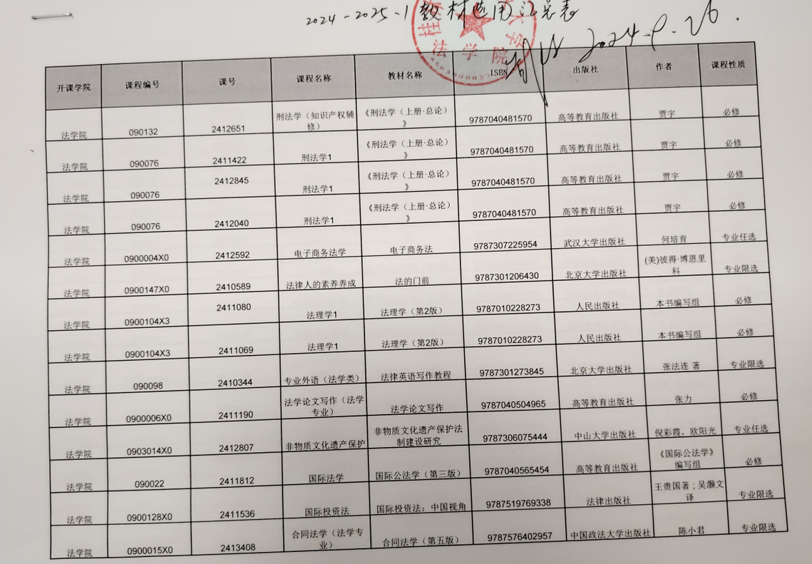各位老师,这是2024-2025.1学期教材选用汇总表进行公示,请各位查看。公示期间为2024年9月26日至2024年9月29日,全院师生在此期间均可提出异议。