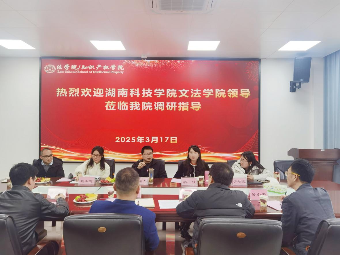 2025年 3月17日下午,湖南科技学院文法学院党总支书记曾二青一行4人到我院调研国际经贸规则专业申报和办学情况。院党委书记吴耀光出席并主持座谈交流会,部分院领导和骨干教师参加会议。 座谈会上,吴耀光代表学院欢迎曾书记一行来访交流,并简要介绍学院情况。曾二青介绍了来访目的和调研的重点。他表示,桂电法学院是国内较早开办国际经贸规则专业的学院,学院办学有特色,有水平,具前瞻性,是很好的学习榜样,希望能加强合作交流,为湖南科技学院文法学院申办新专业提供宝贵经验和智力支撑。学院赵玉意教授主要就国际经贸规则专业申报的切入点、人才储备、地域优势、线上线下调研、用人单位的需求等方面作了经验介绍,对适当调整课程设置和实践环节、“以赛促教”、充分利用校友资源为应届毕业生提供更多更优的实习实践机会和平台等方面做了细致分享。其他与会领导和老师也就交流的焦点和问题做了很好的补充。双方互动交流热烈,氛围融洽。在会上大家一致认为,国际经贸规则专业培养的学生不仅应具备扎实的法学专业基础,同时应具备国际经贸知识、国际视野和沟通谈判能力等素养,对标高标准国际经贸规则,紧跟新时代发展步伐,培养更多国家和社会需求的高素质涉外法治人才。
