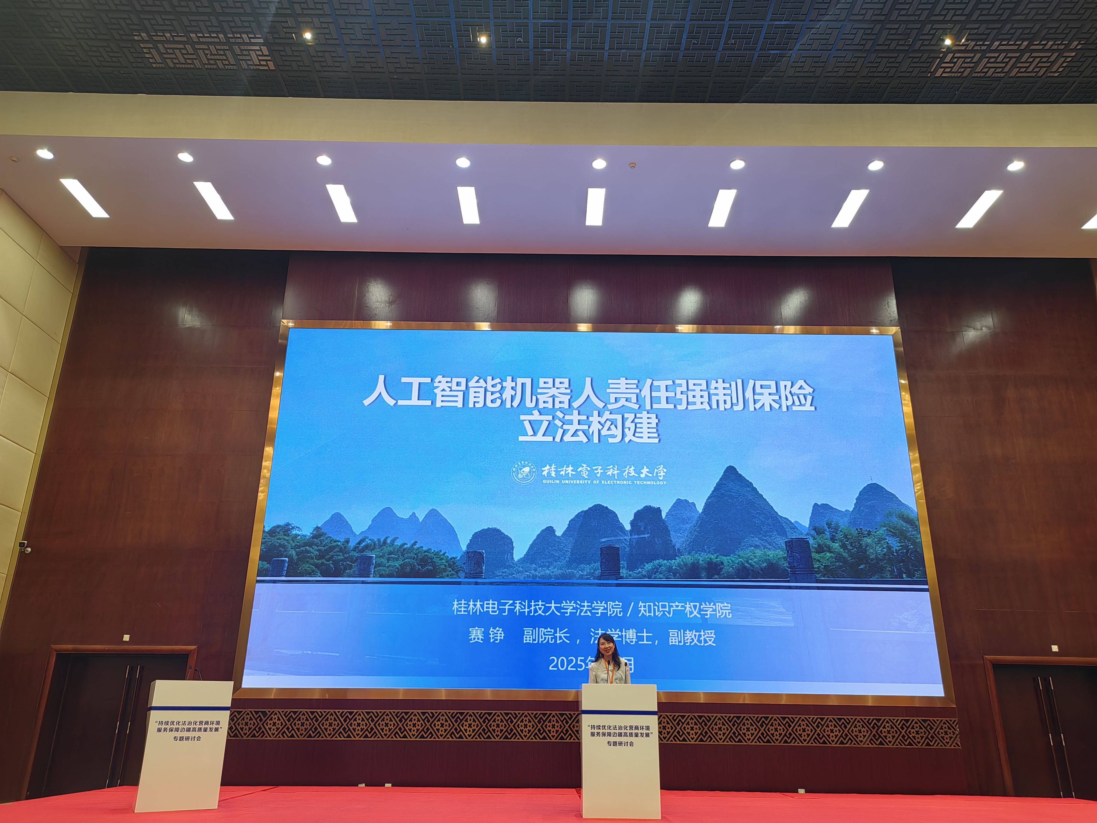 研讨会设置“人工智能赋能法治建设与人工智能治理法治化”“深入贯彻民营经济促进法促进经济持续健康高质量发展”“中国—东盟商贸合作及法治保障”“涉外法治人才培养工作思路及路径”等专题。赛铮与刘广裕分别以《人工智能机器人责任强制保险立法构建》、《构建民营科技企业参与重大工程数智化建设的法治保障》为题,作大会主题发言,展示了各自在科技与法治交叉领域的前沿研究成果和学术面貌。