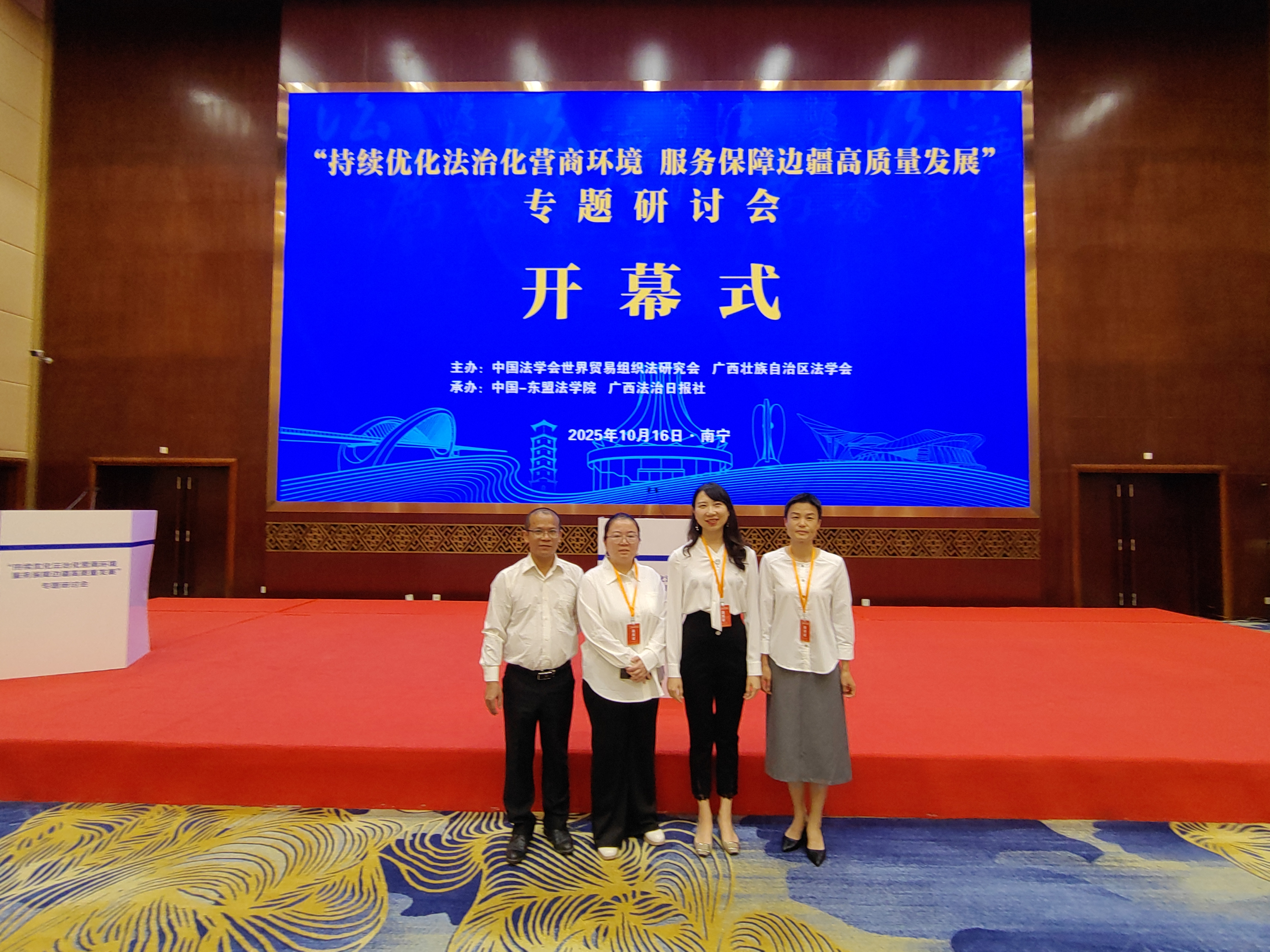 10月16日,“持续优化法治化营商环境 服务保障边疆高质量发展”专题研讨会在南宁市举行。本次研讨会由中国法学会世贸组织法研究会与广西壮族自治区法学会联合主办,全国相关高校、科研机构、实务部门专家学者,以及越南法学法律界人士参加研讨。学院副院长赛铮、国际经贸规则系主任方梦源以及刘广裕、黄保持博士受邀参会。