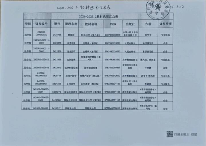 各位老师。这是2024-2025.2教材选用的汇总表,请各位查看。公示期间为2025年3月8日至3月11日,全院师生在此期间均可提出异议。