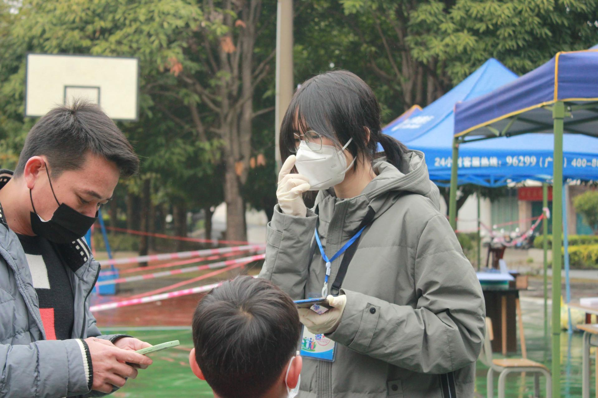 第一天居民们积极配合,自动有序排好了长队,其中一幕我至今难以忘记,一名婆婆搀扶着老爷爷横跨过队伍,略微茫然地站在人群中间,我看到就快速过去询问情况,婆婆面容焦急,反复说“他站不得,不会弄这个”。询问过后,没有手机,只带了身份证,老爷爷眼睛失明、腿脚还不便,却依旧坚持走到了操场。我们有为特殊情况的居民设置了绿色通道,老弱病残特殊居民都是报备给社区,医护志愿者上门采集。