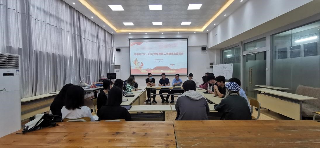 2022年4月27日上午10点,艺术与设计学院动画系在14教5楼展厅开展了动画系2021-2022学年度第二学期师生座谈会,会议由动画系主任彭玉元老师主持,黄晓艳老师进行记录,参会的成员还有艺术与设计学院李旭副院长、动画系教师黎成茂、赵勤恒、韩露、杨倩、兰旭以及动画专业大二、大三、大四的12名学生代表。