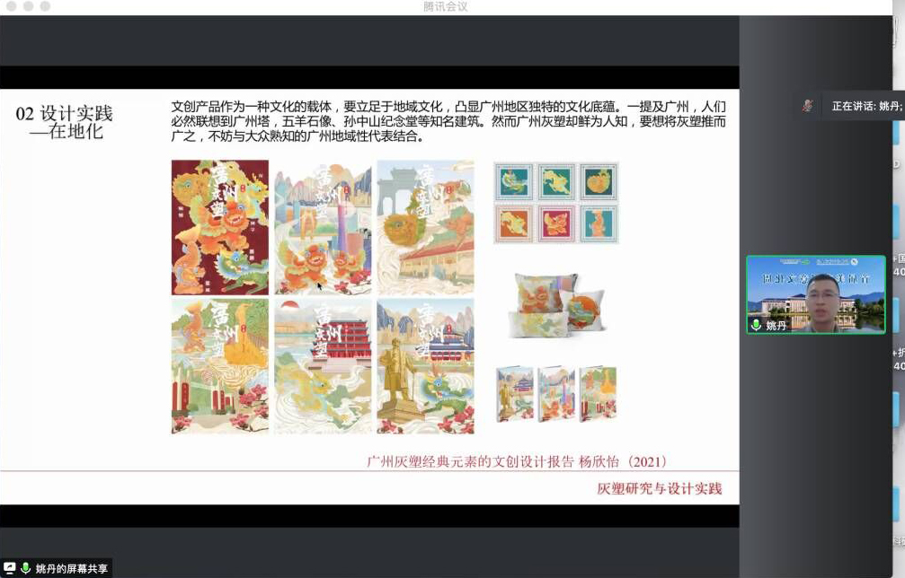 姚丹副教授从实际案例出发,生动形象地向大家分享了如何以项目驱动广州灰塑这一非物质文化遗产在新时代背景下的融合设计研究与实践,并向大家展示了灰塑的工艺流程以及优秀学生作品。,姚丹副教授给师生带来了一场干货满满的演讲,内容丰富、意义深刻,此次讲座对我院广大师生在今后的课题申报、设计实践等方面都带来新的思路与方向。