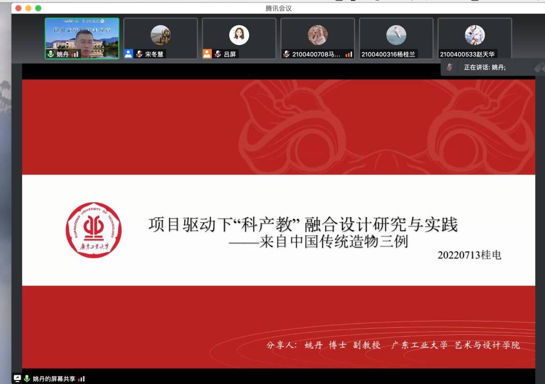 7月13日,艺术与设计学院视觉传达专业邀请广东工业大学艺术与设计学院姚丹副教授,在腾讯会议举办题为“项目驱动下‘科产教’融合设计研究与实践”的学术讲座,会议由视觉传达专业宋冬慧老师主持,艺术与设计学院副院长吕屏出席并致辞,院系师生近200人参加了讲座。