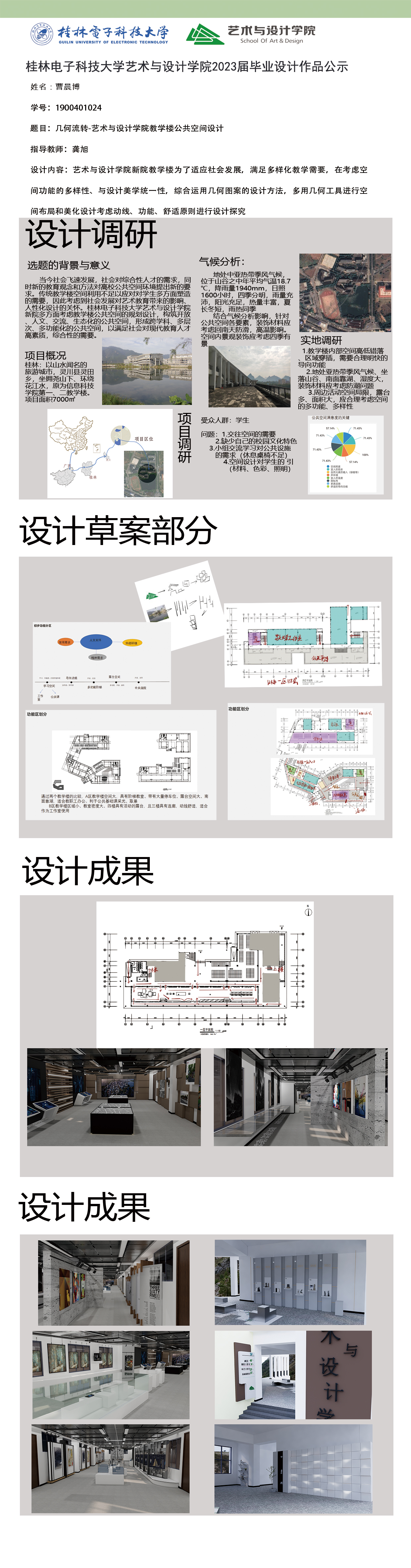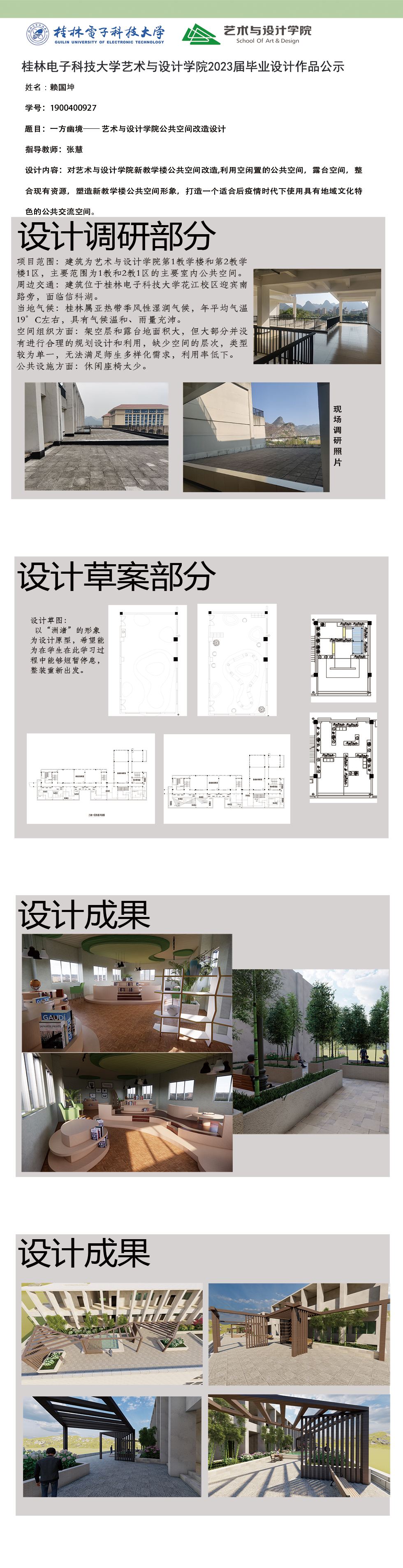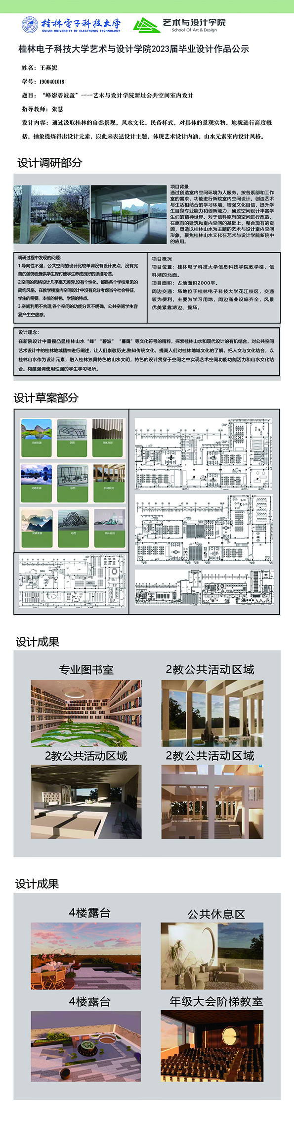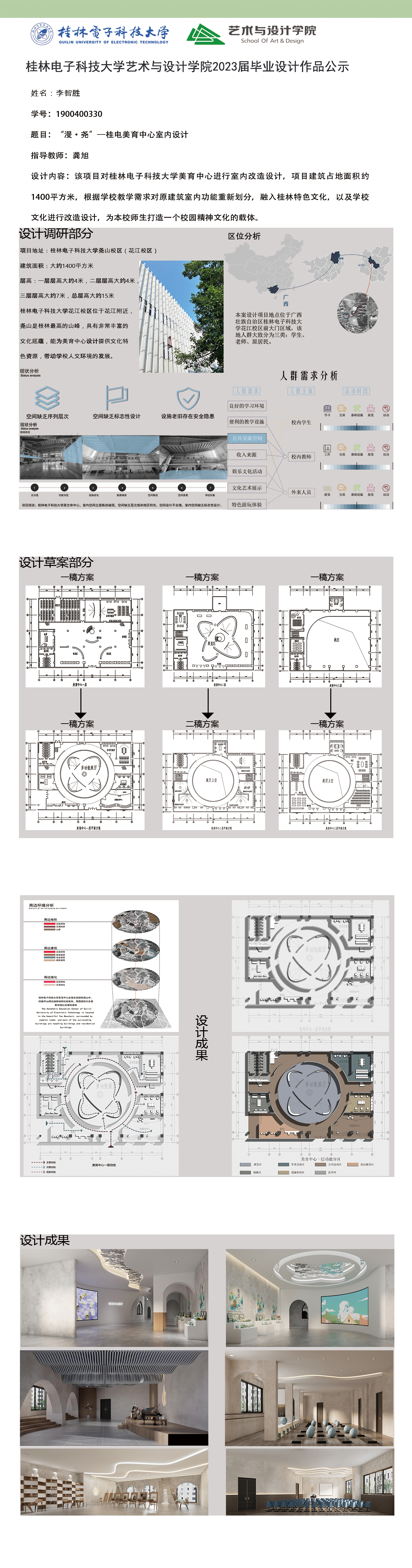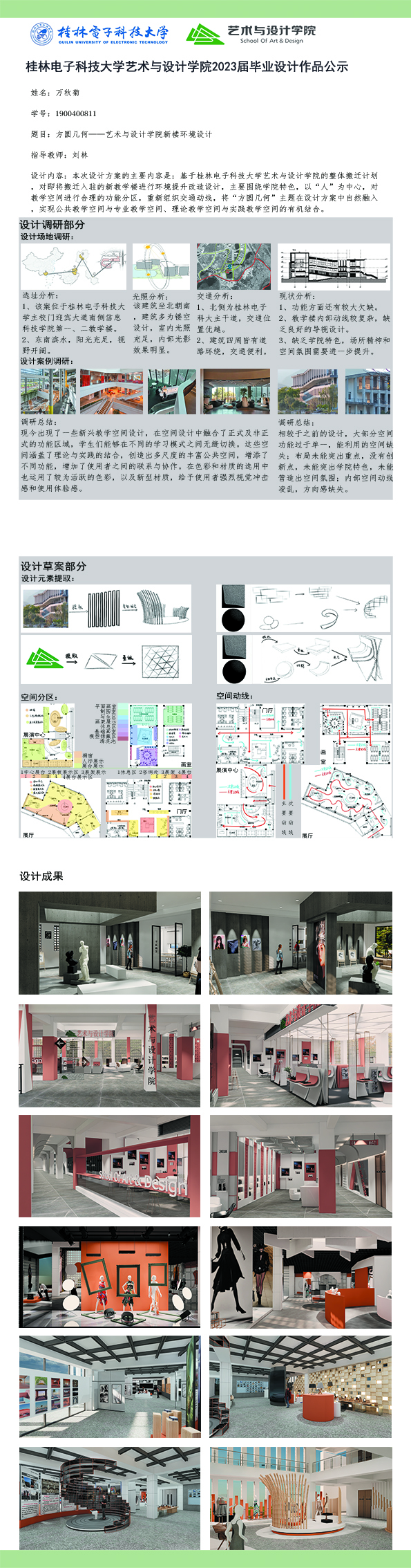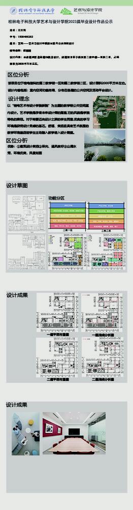 根据毕业设计管理文件规定,现将2023届环境设计专业毕业设计作品进行公示。对所公示的作品如有疑议,请实名举证。公示期为三天(2023.04.19-2023.04.21)。作品公示期间的意见反馈邮箱:19059776@qq.com,联系电话:13457651975。
