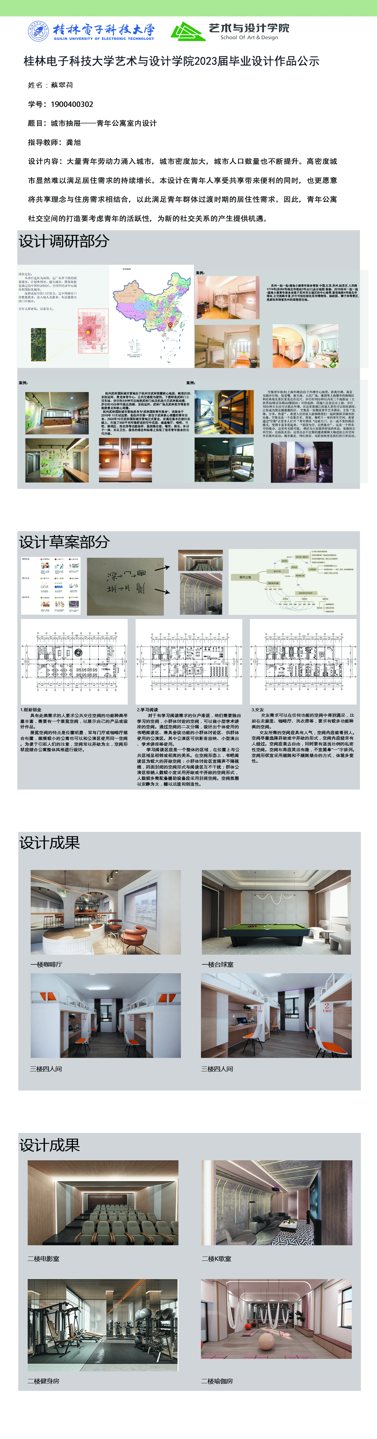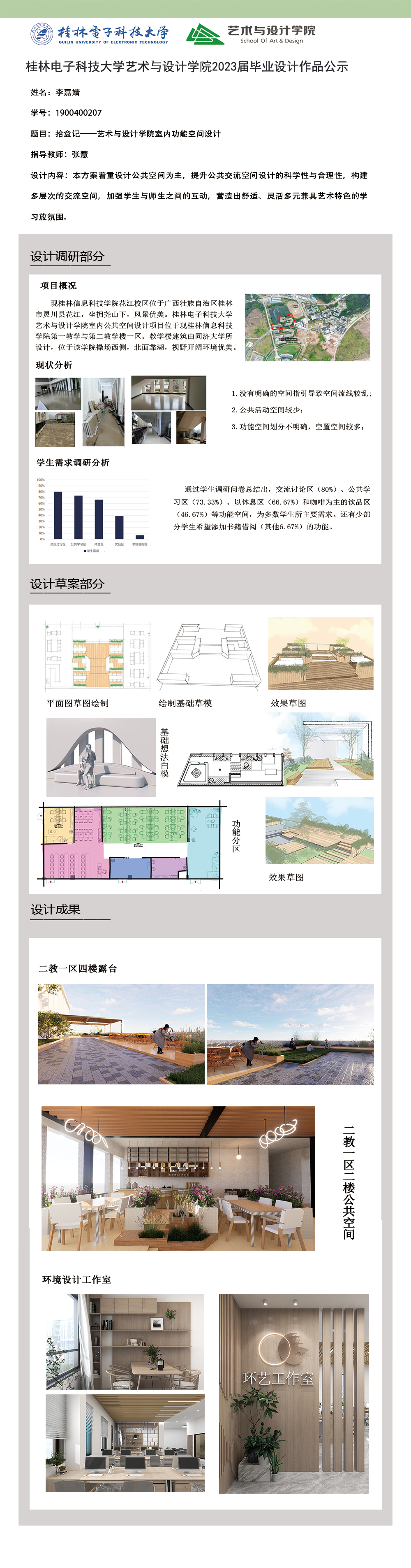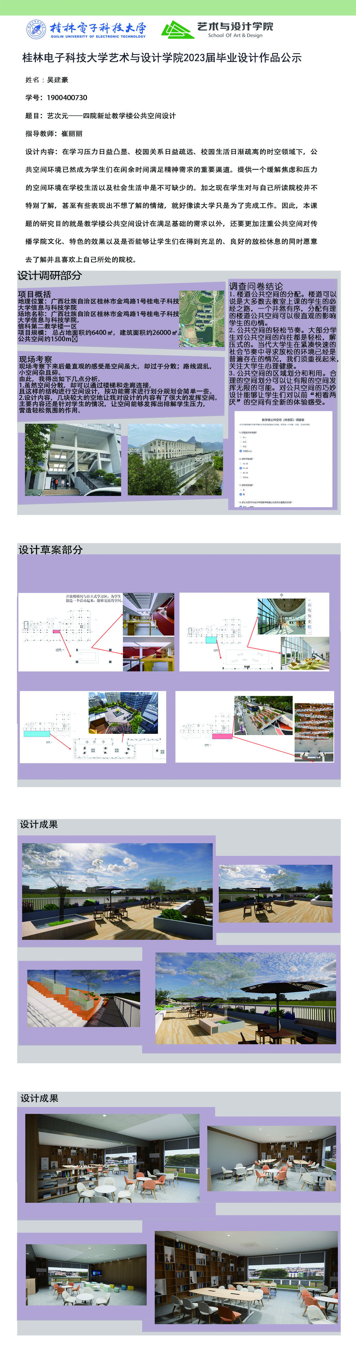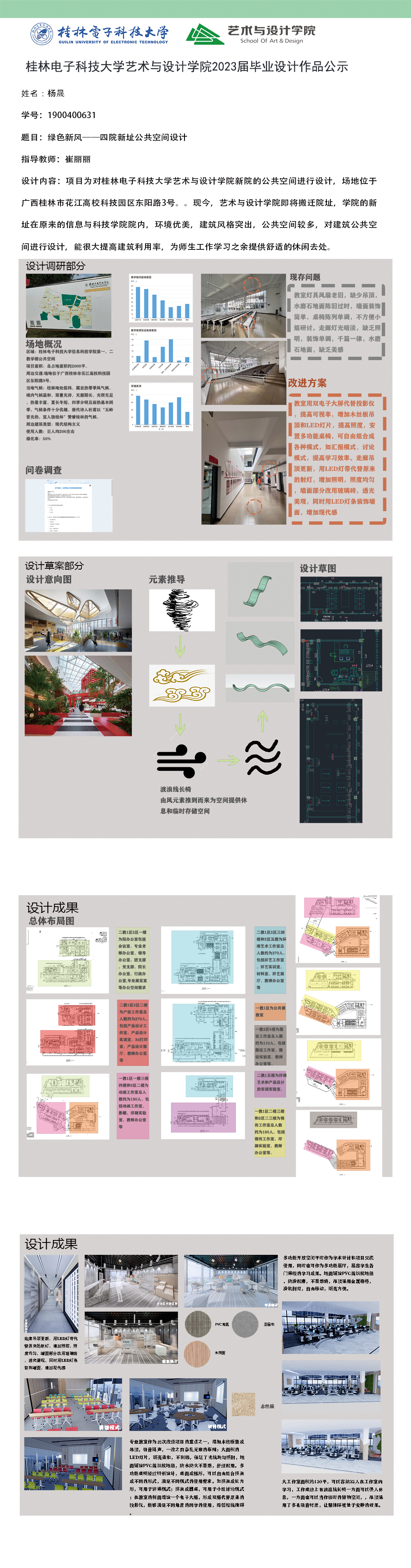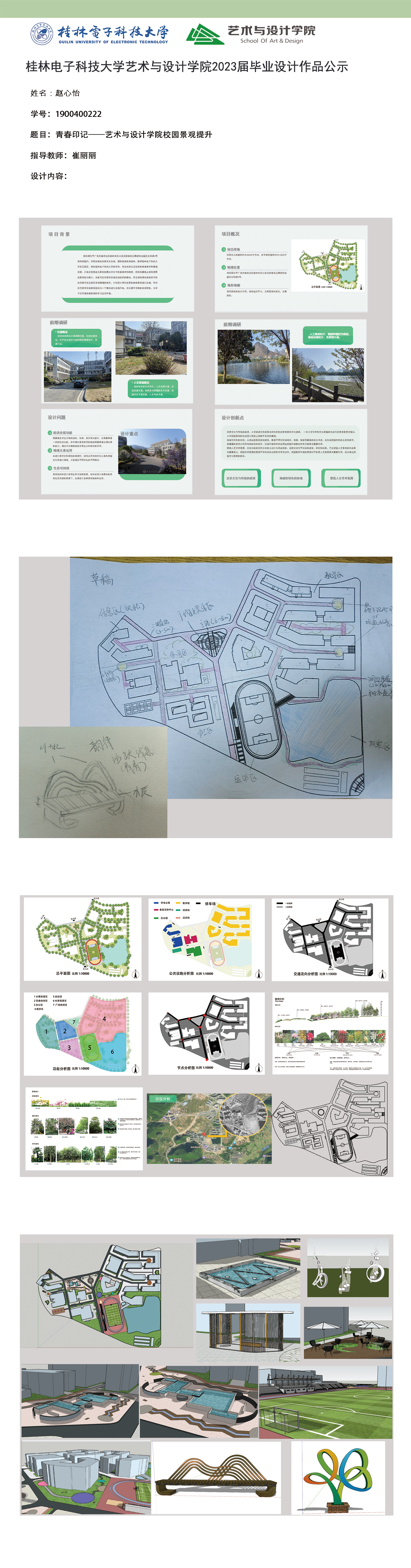 根据毕业设计管理文件规定,现将2023届环境设计专业毕业设计作品进行公示。对所公示的作品如有疑议,请实名举证。公示期为三天(2023.04.19-2023.04.21)。作品公示期间的意见反馈邮箱:19059776@qq.com,联系电话:13457651975。