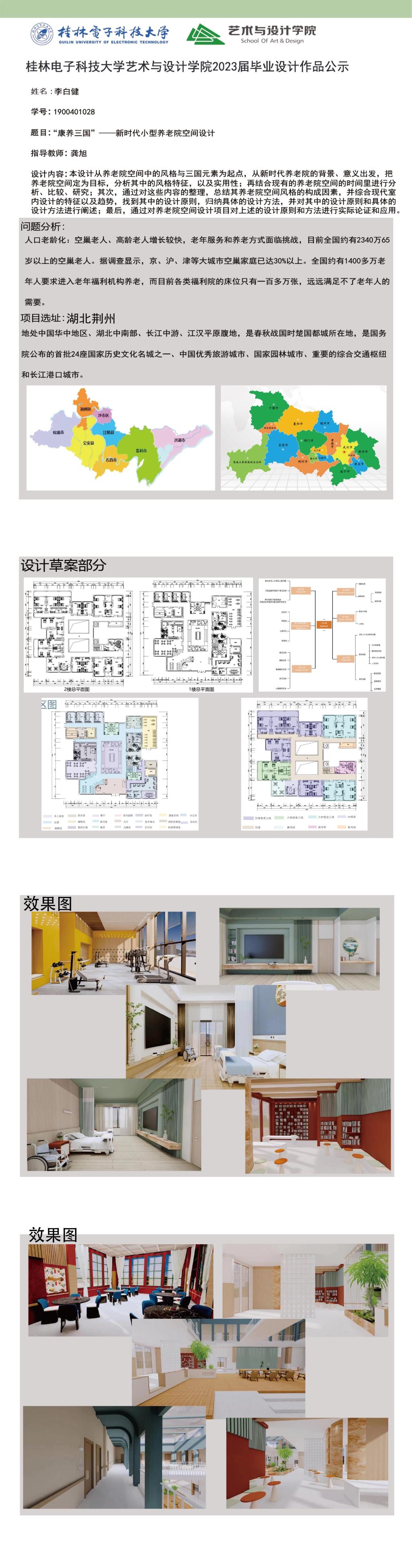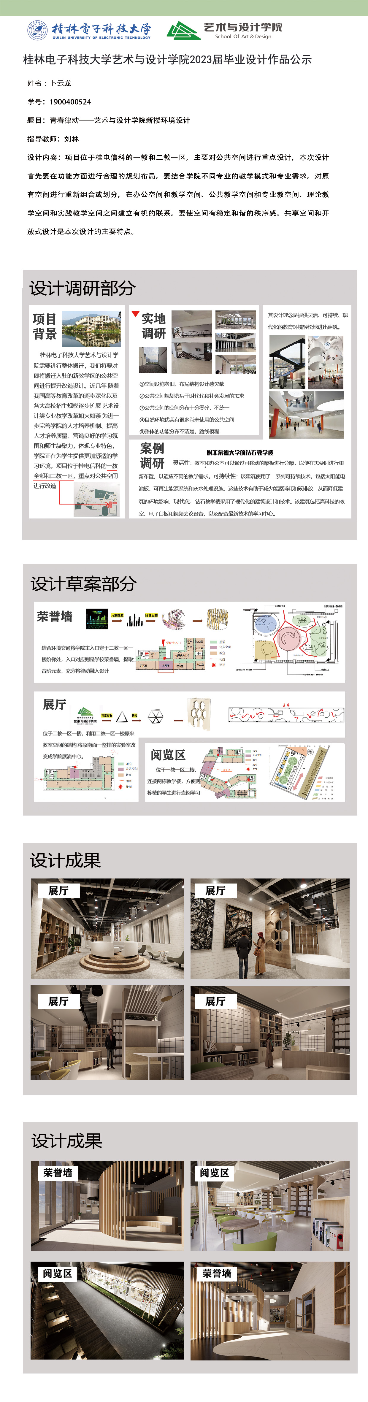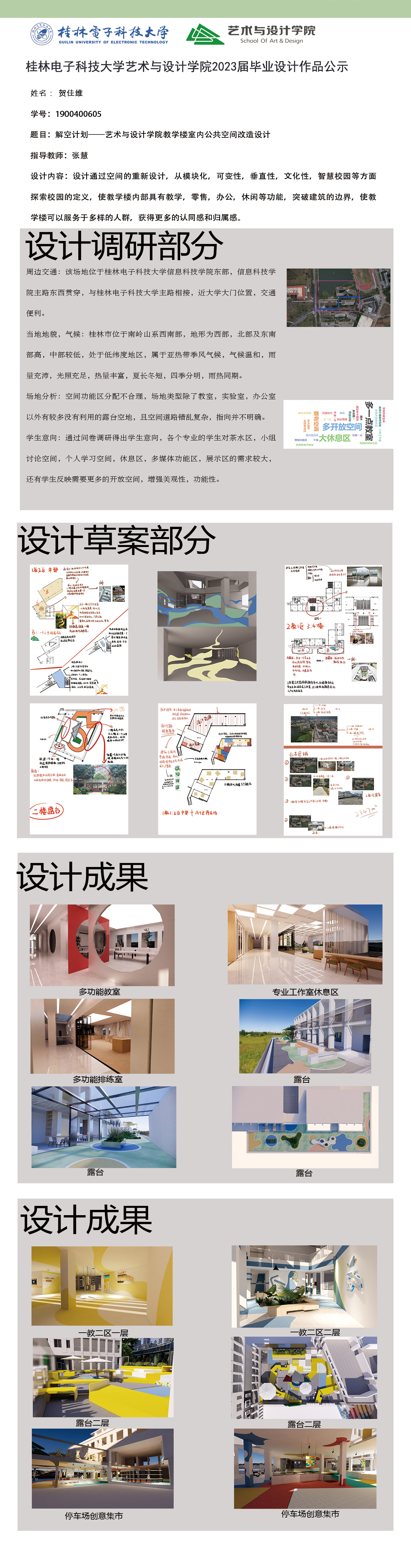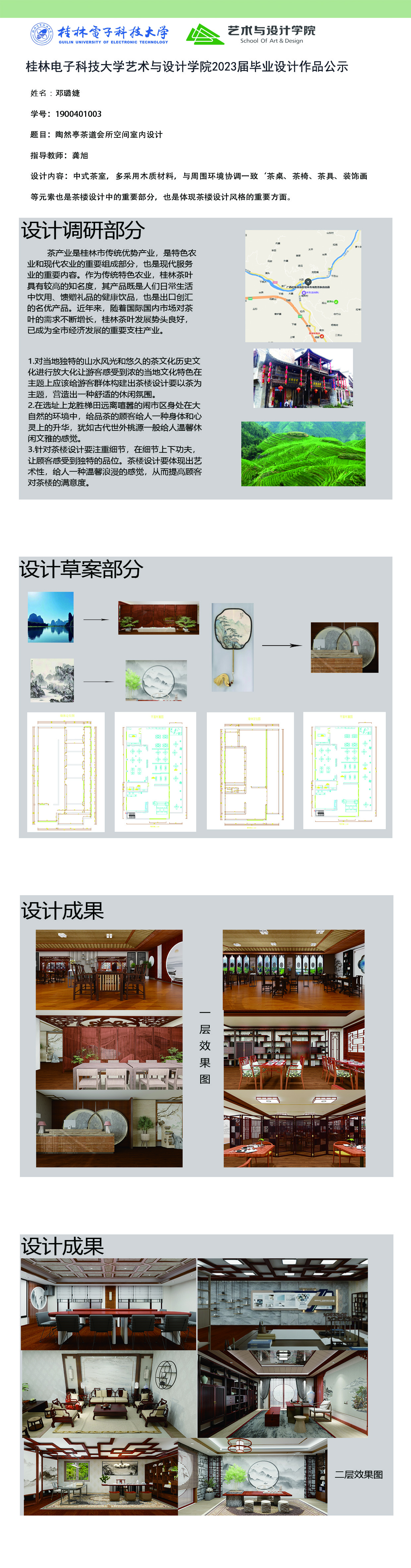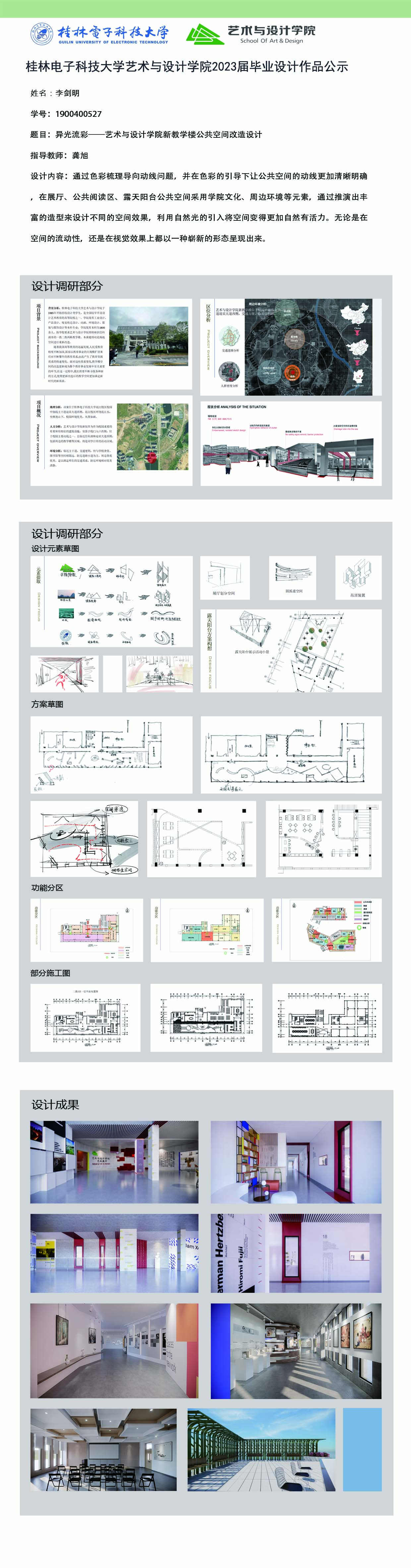 根据毕业设计管理文件规定,现将2023届环境设计专业毕业设计作品进行公示。对所公示的作品如有疑议,请实名举证。公示期为三天(2023.04.19-2023.04.21)。作品公示期间的意见反馈邮箱:19059776@qq.com,联系电话:13457651975。