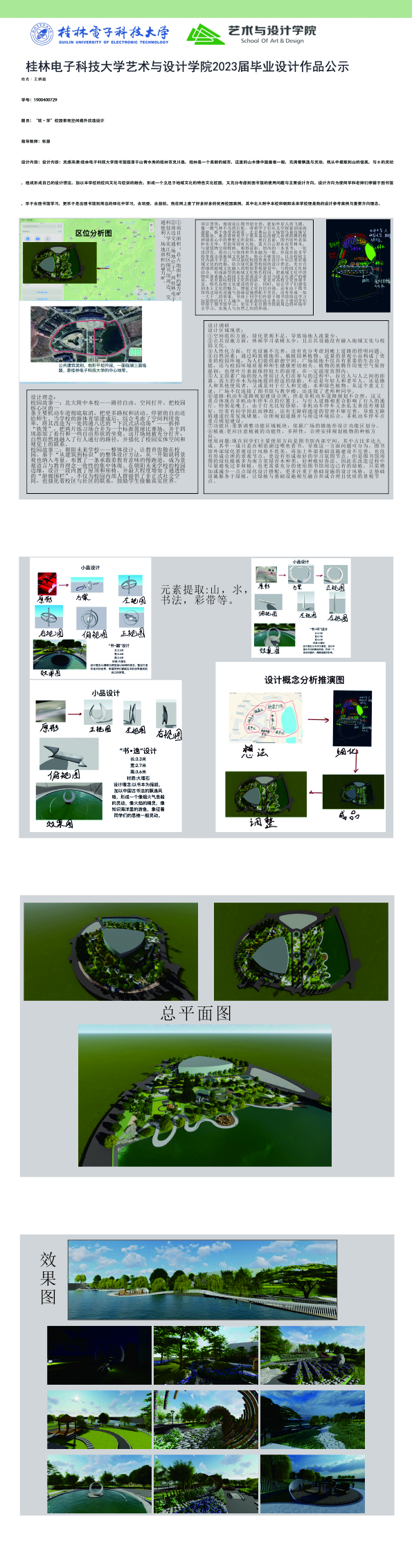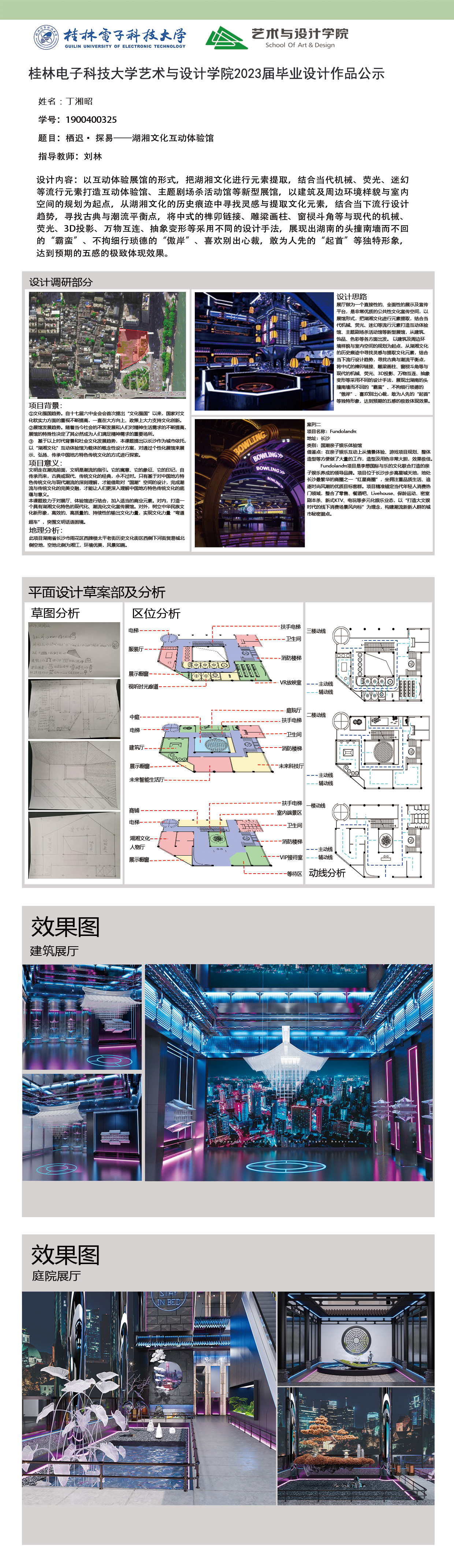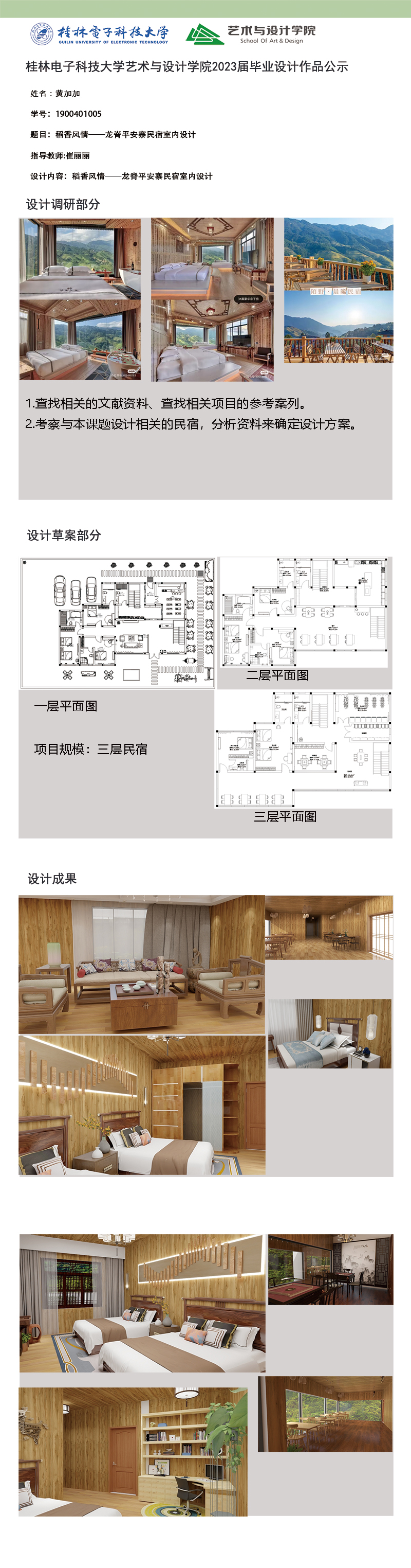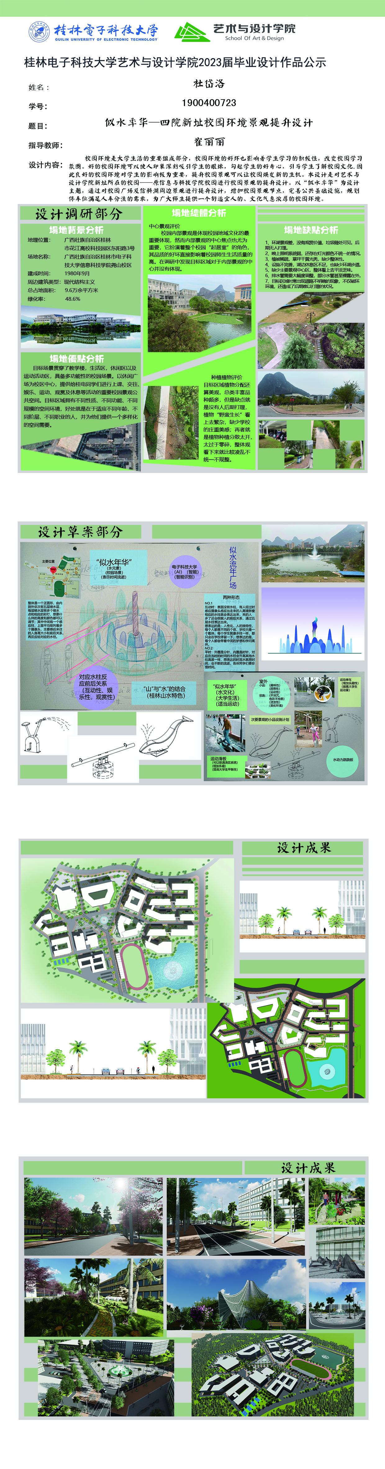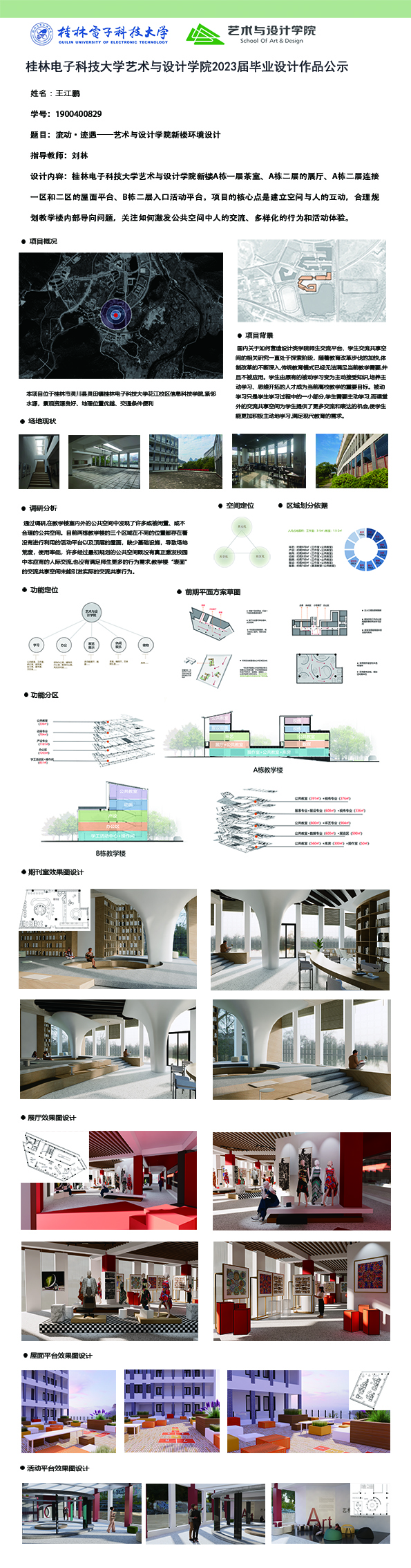 根据毕业设计管理文件规定,现将2023届环境设计专业毕业设计作品进行公示。对所公示的作品如有疑议,请实名举证。公示期为三天(2023.04.19-2023.04.21)。作品公示期间的意见反馈邮箱:19059776@qq.com,联系电话:13457651975。