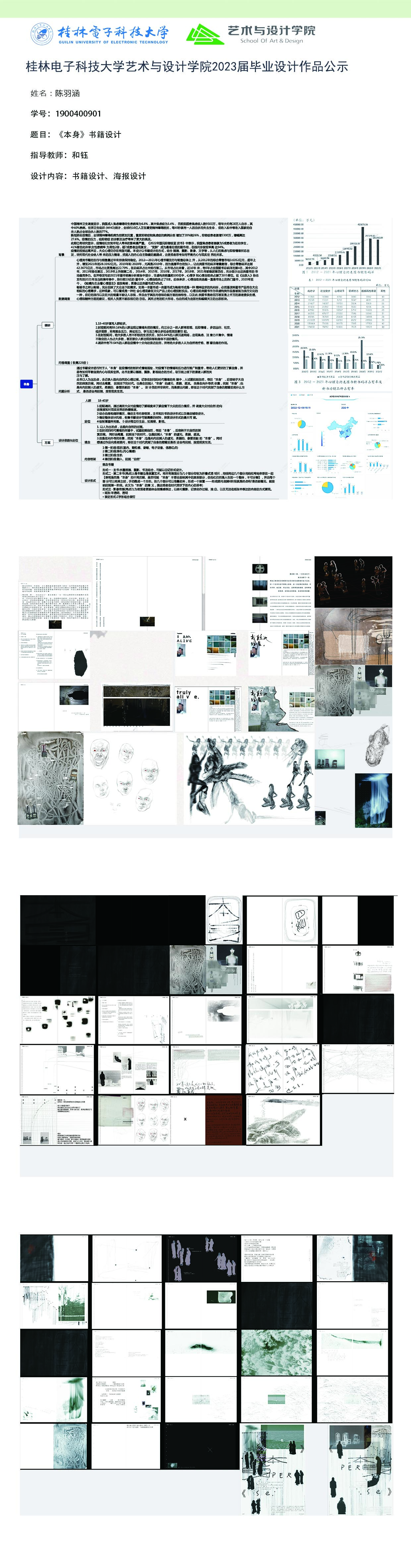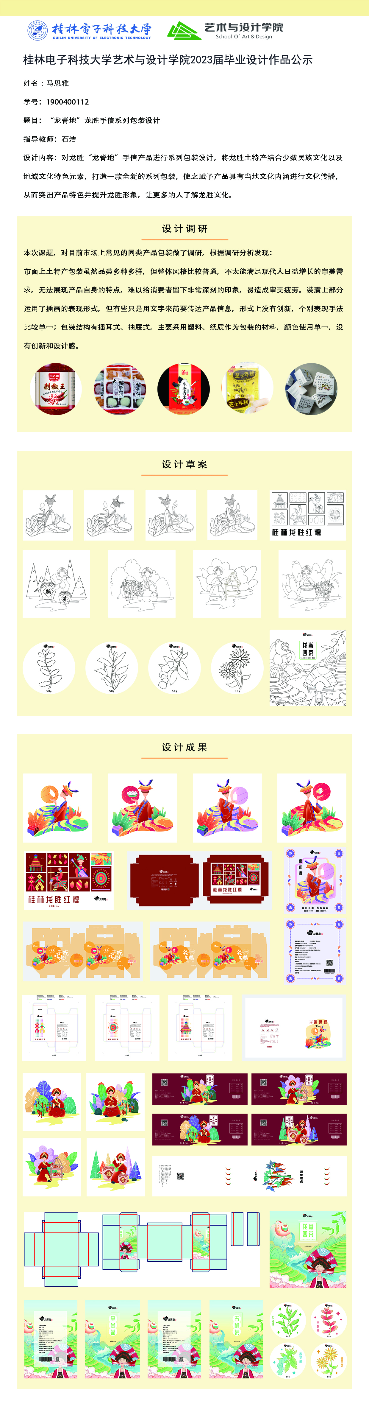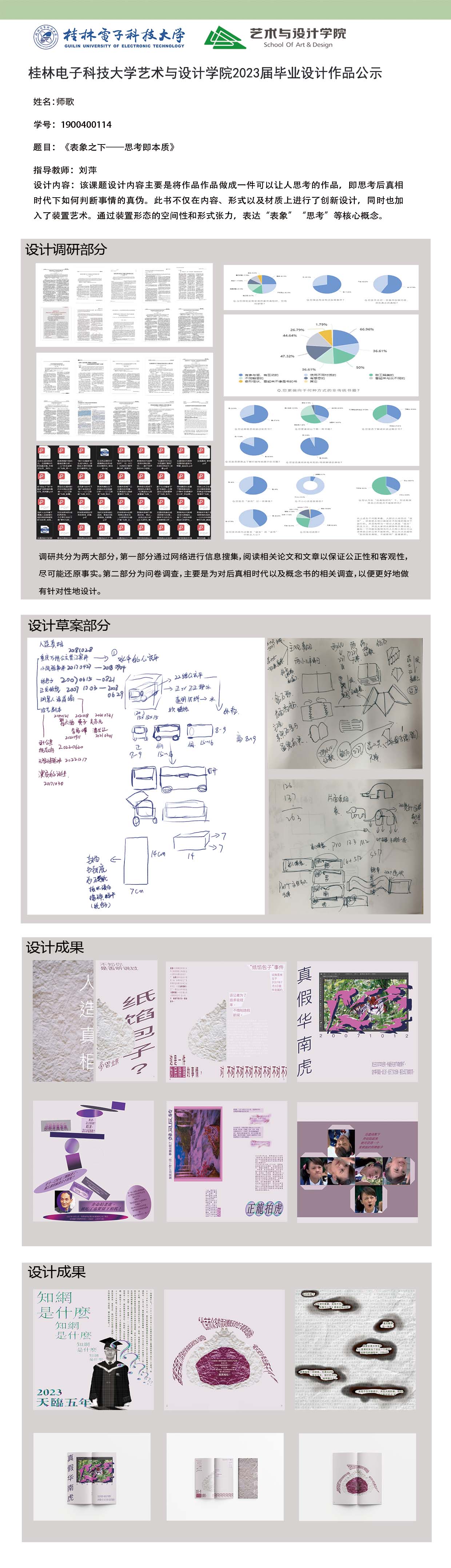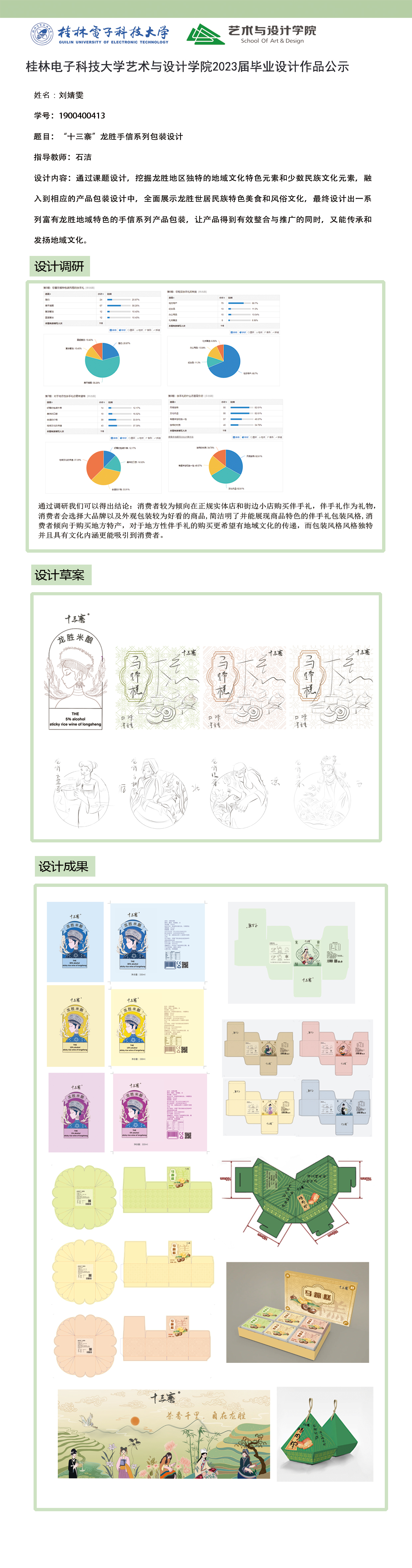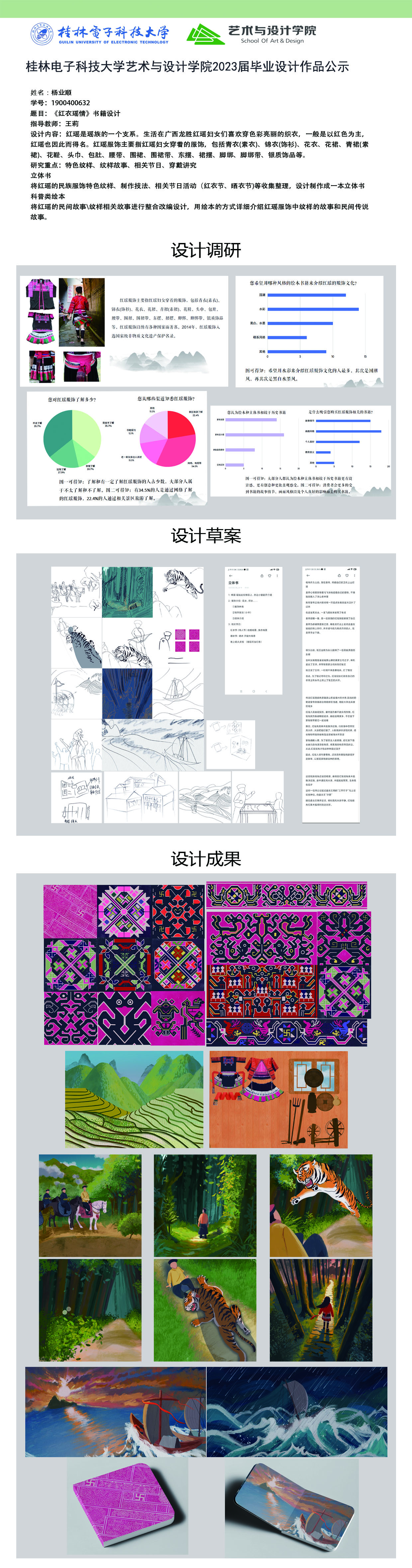 根据毕业设计管理文件规定,现将2023届视觉传达设计专业毕业设计作品进行公示。对所公示的作品如有疑议,请实名举证。公示期为三天(2023.04.20-2023.04.22)。作品公示期间的意见反馈邮箱:4575145@qq.com,联系电话:18677370501。