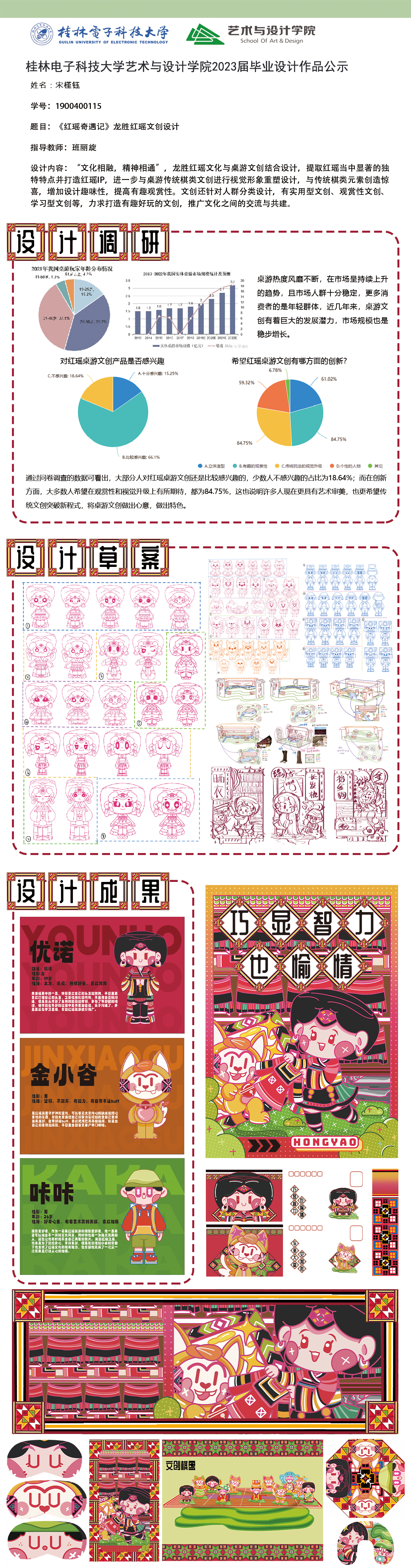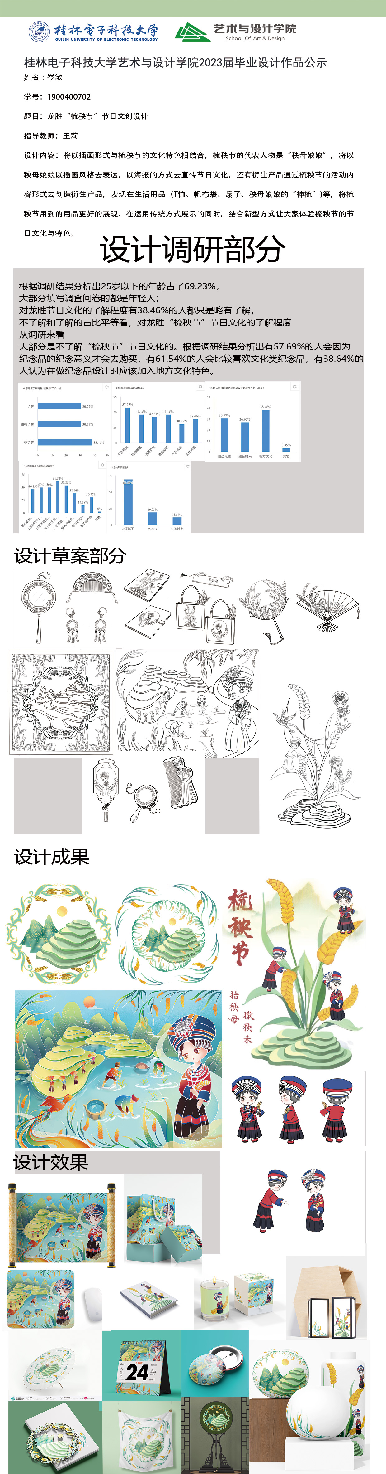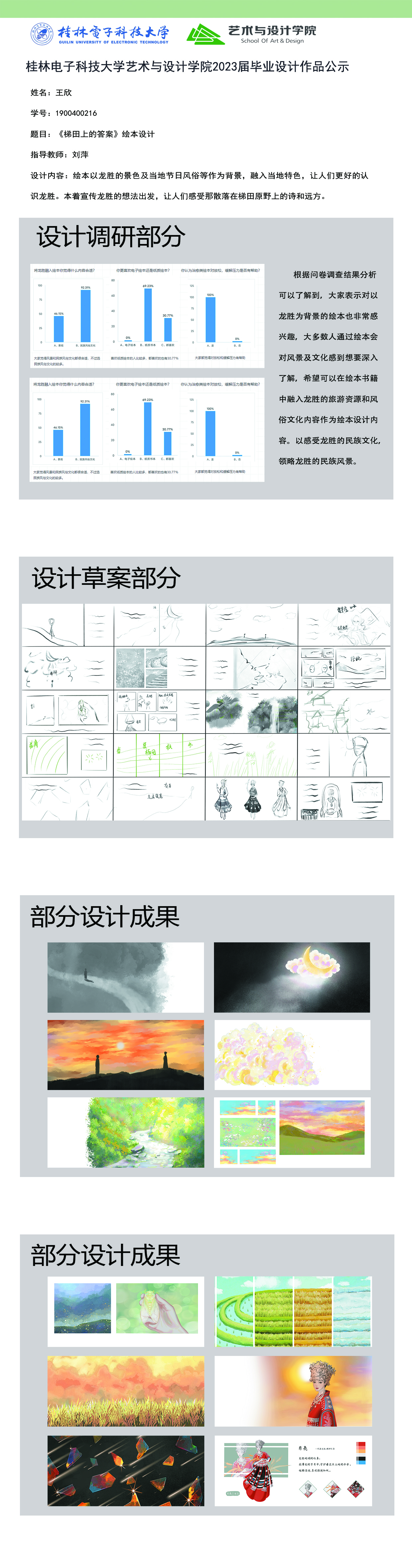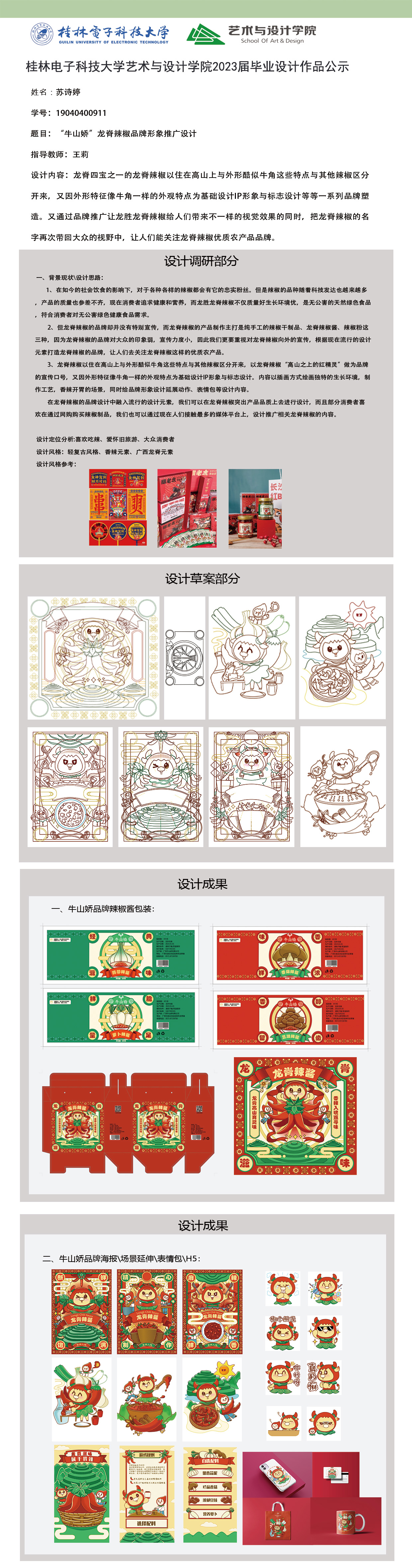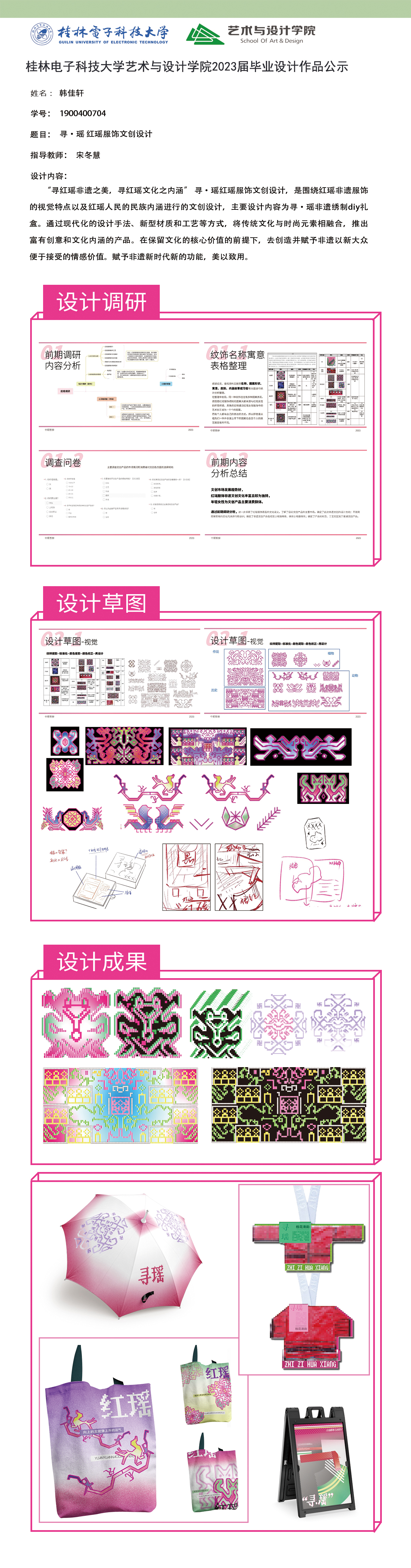 根据毕业设计管理文件规定,现将2023届视觉传达设计专业毕业设计作品进行公示。对所公示的作品如有疑议,请实名举证。公示期为三天(2023.04.20-2023.04.22)。作品公示期间的意见反馈邮箱:4575145@qq.com,联系电话:18677370501。