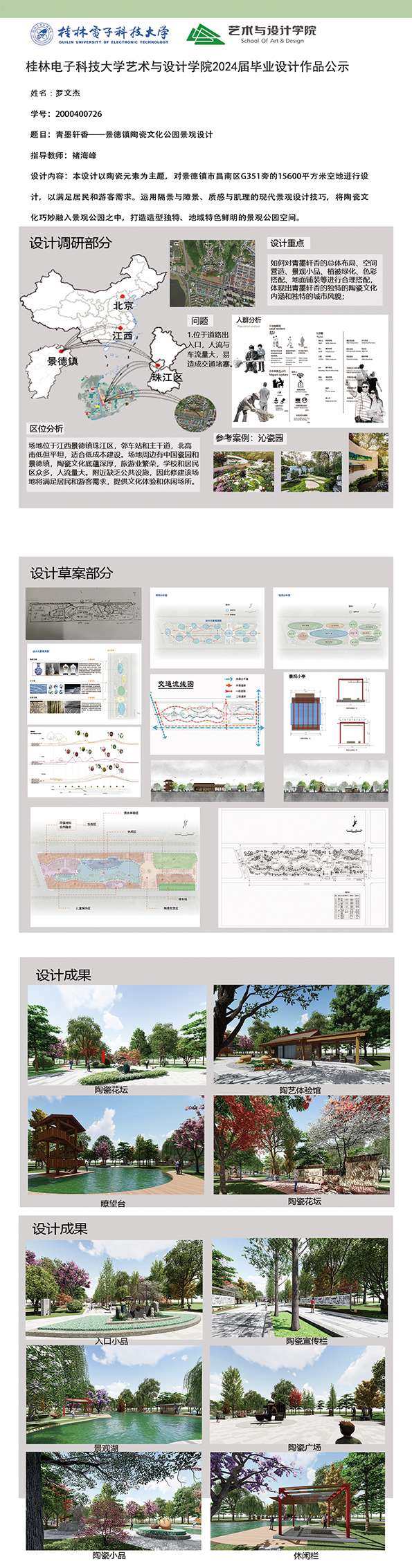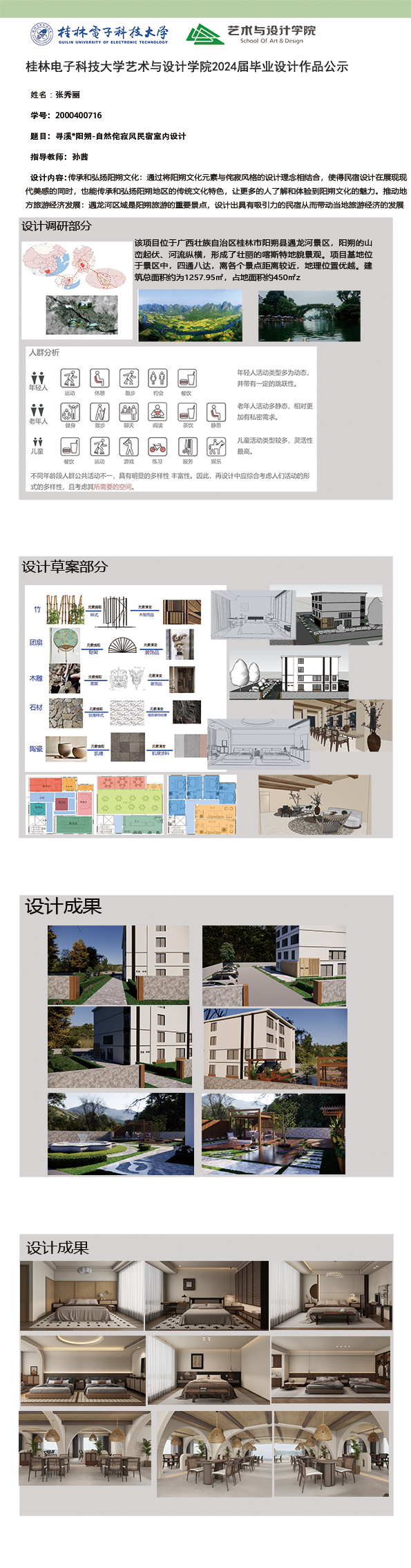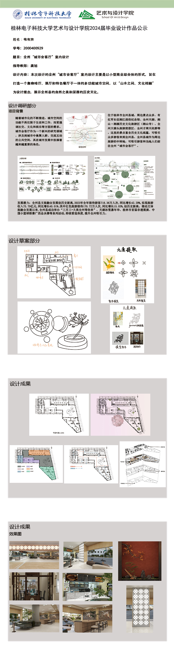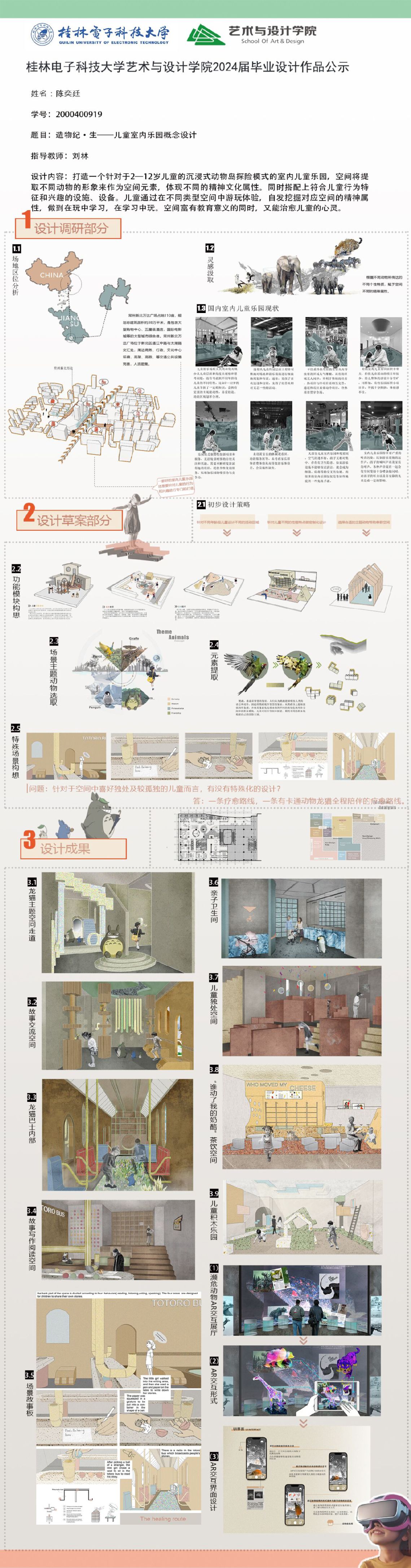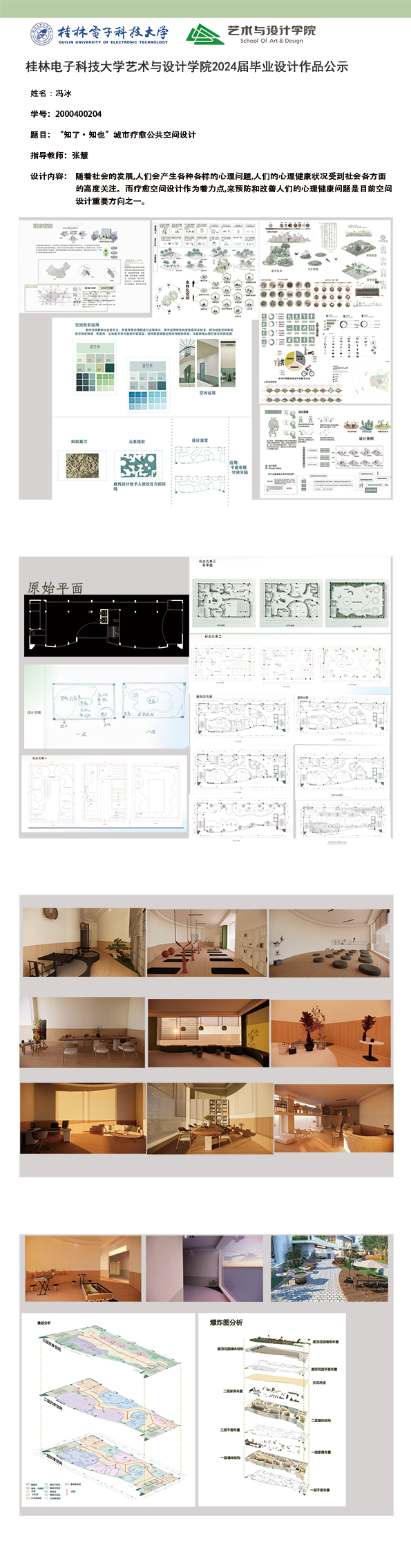 根据毕业设计管理文件规定,现将2024届环境设计专业毕业设计作品进行公示。对所公示的作品如有疑议,请实名举证。公示期为三天(2024.04.24-2024.04.26)。作品公示期间的意见反馈邮箱:19059776@qq.com,联系电话:13457651975。