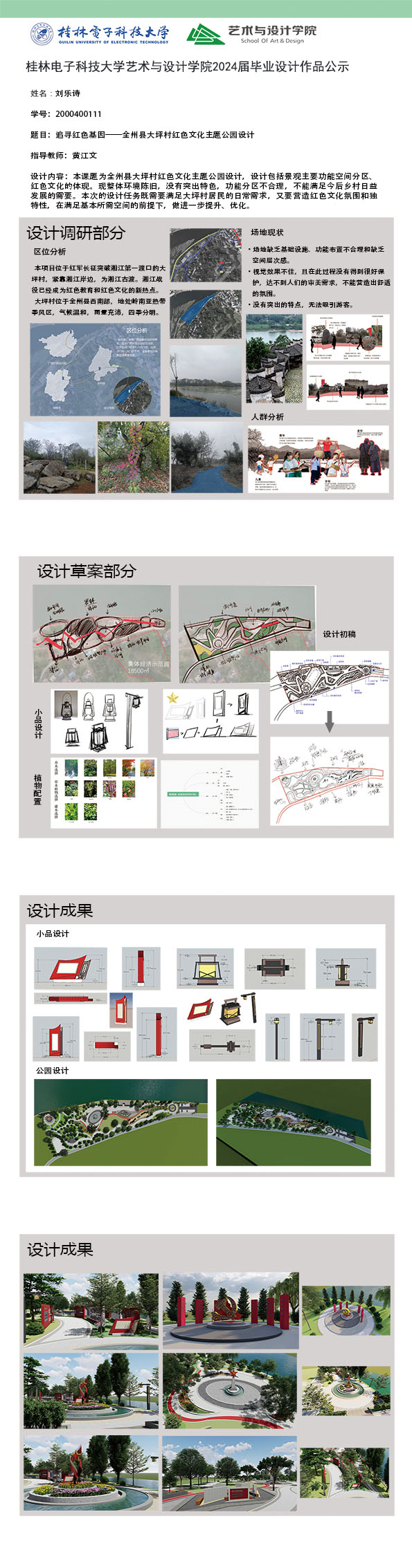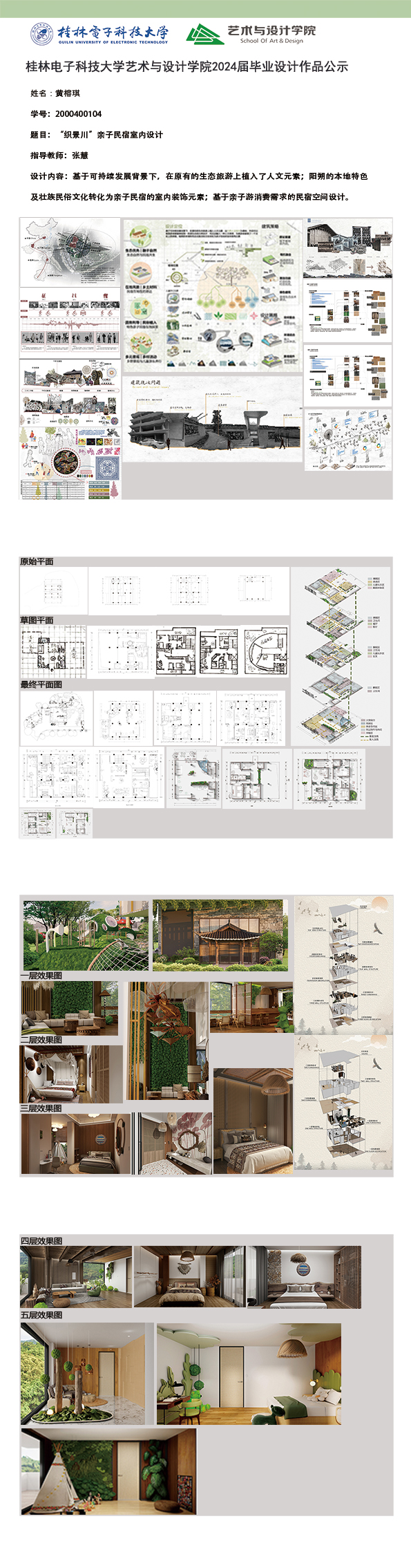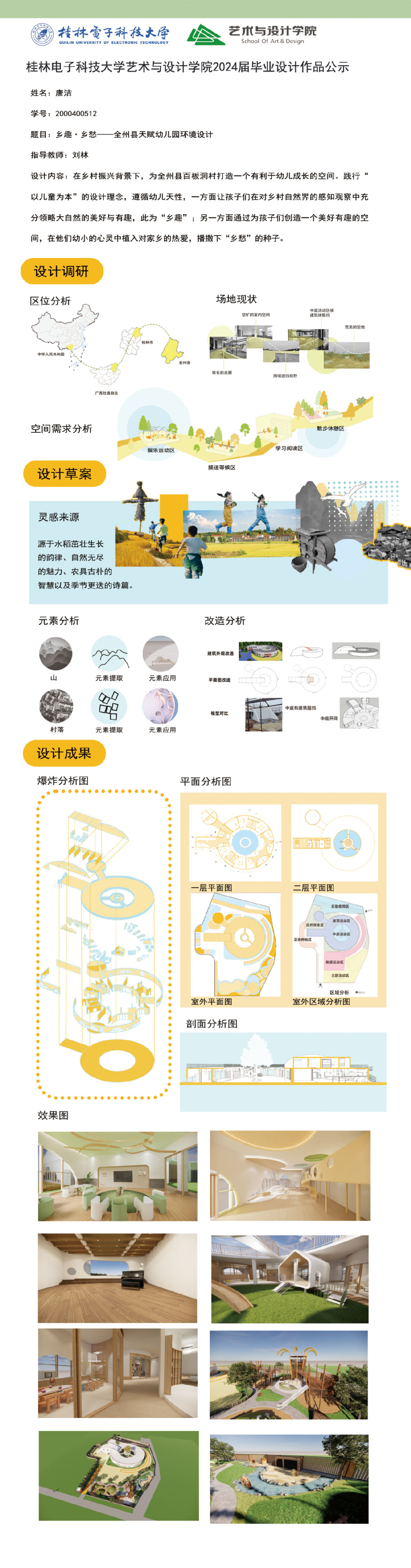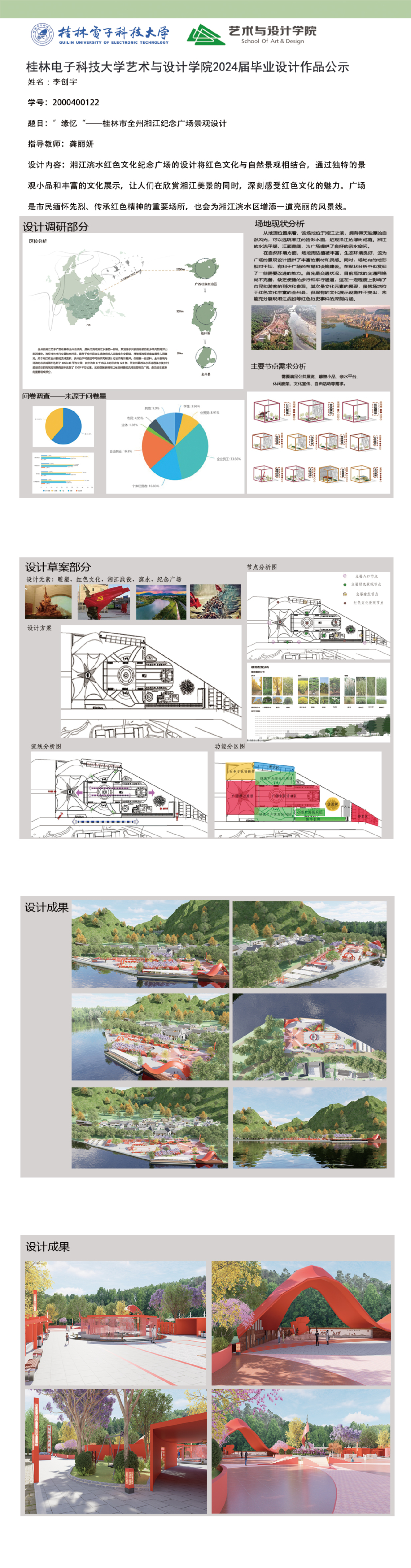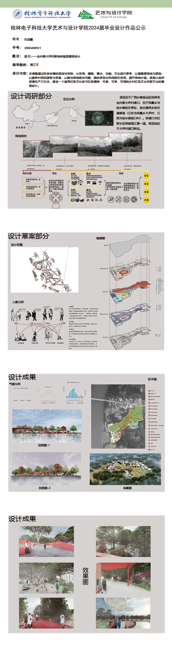 根据毕业设计管理文件规定,现将2024届环境设计专业毕业设计作品进行公示。对所公示的作品如有疑议,请实名举证。公示期为三天(2024.04.24-2024.04.26)。作品公示期间的意见反馈邮箱:19059776@qq.com,联系电话:13457651975。
