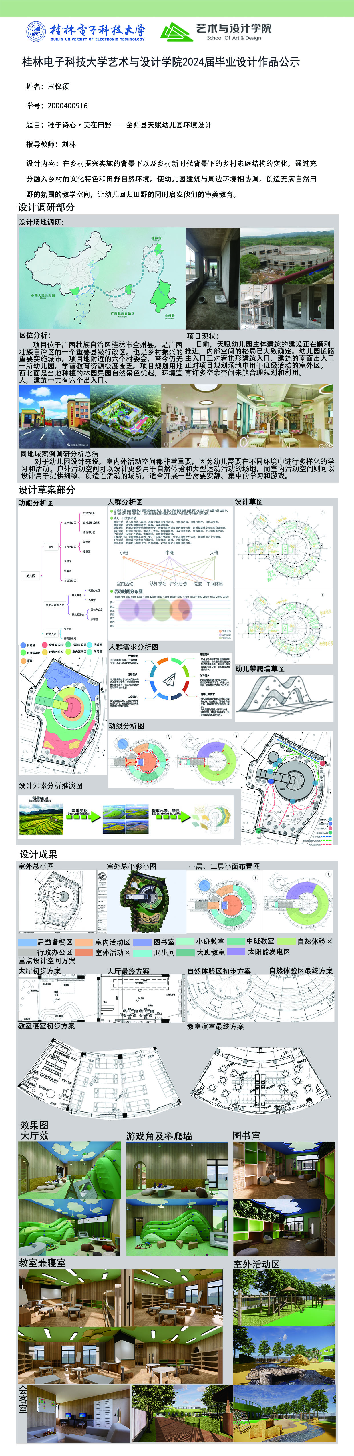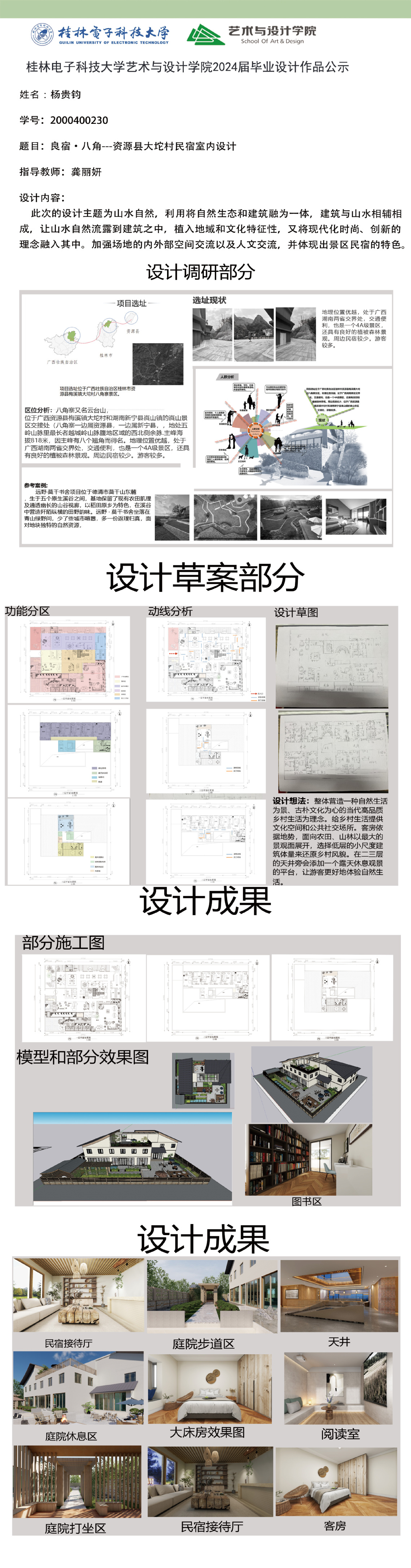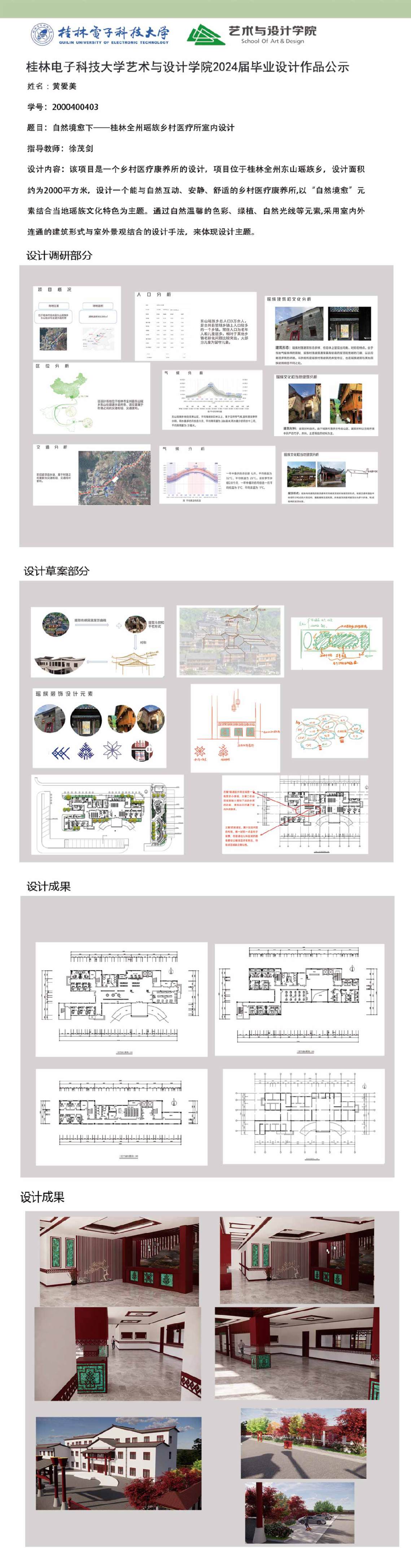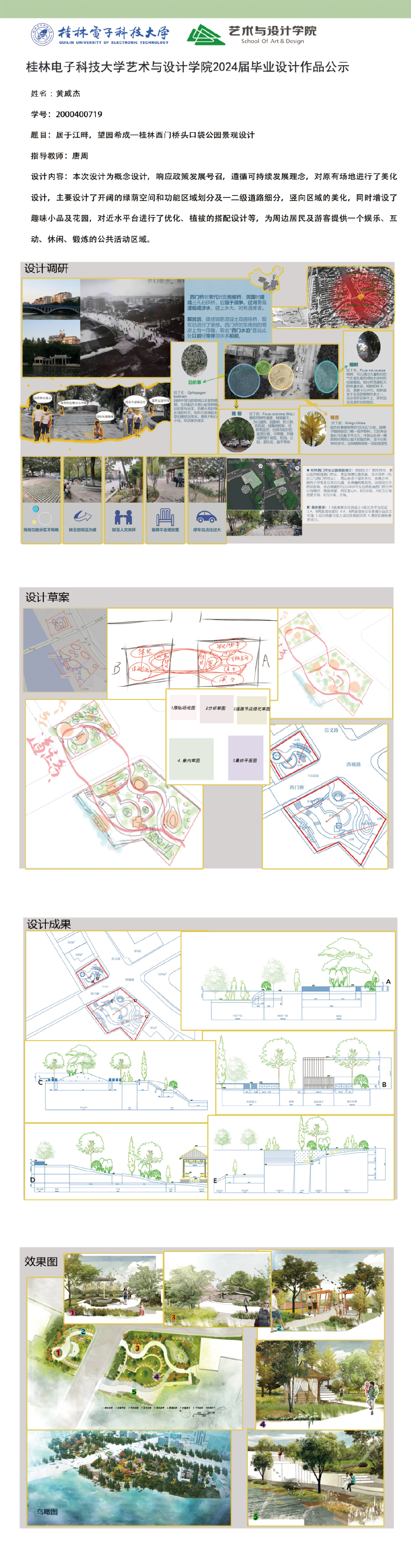 根据毕业设计管理文件规定,现将2024届环境设计专业毕业设计作品进行公示。对所公示的作品如有疑议,请实名举证。公示期为三天(2024.04.24-2024.04.26)。作品公示期间的意见反馈邮箱:19059776@qq.com,联系电话:13457651975。