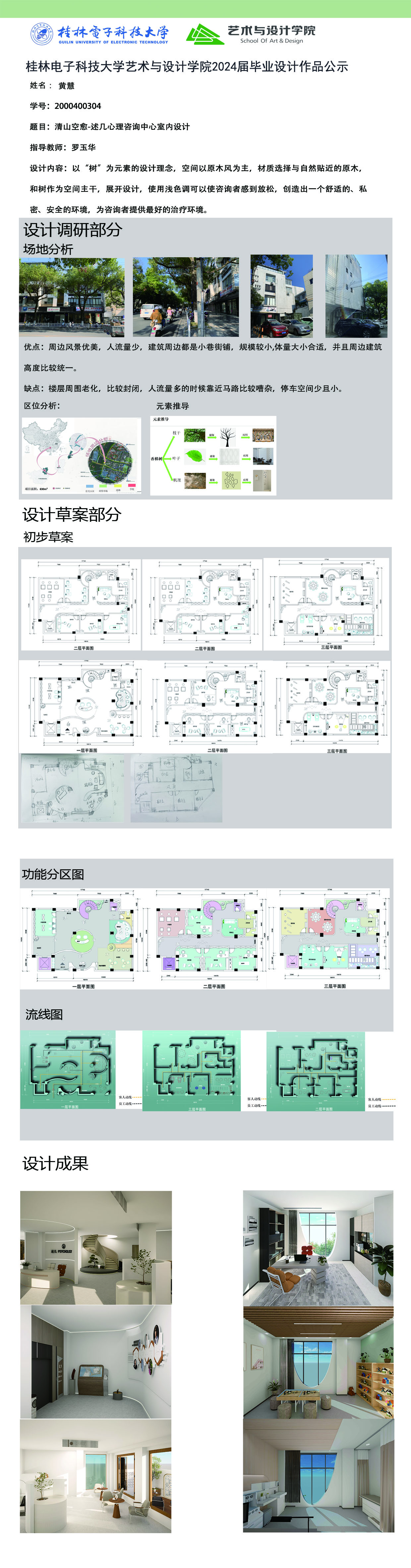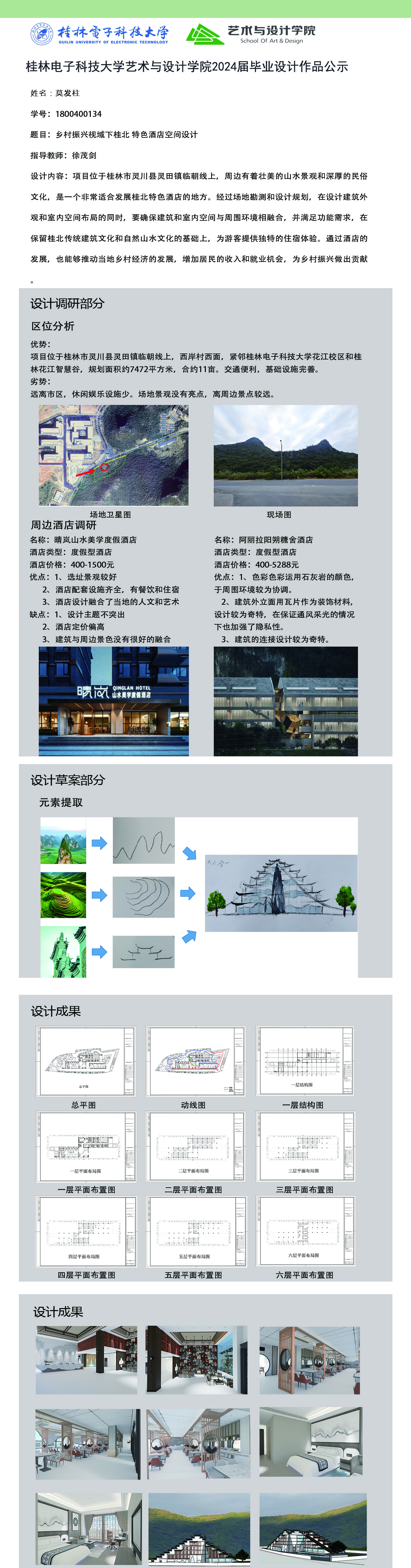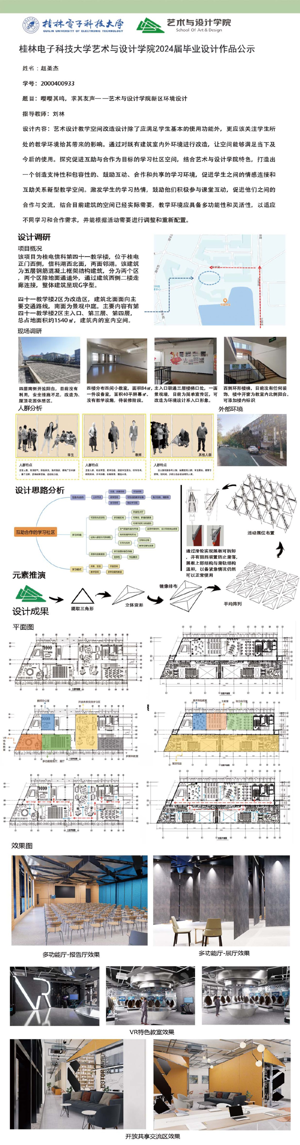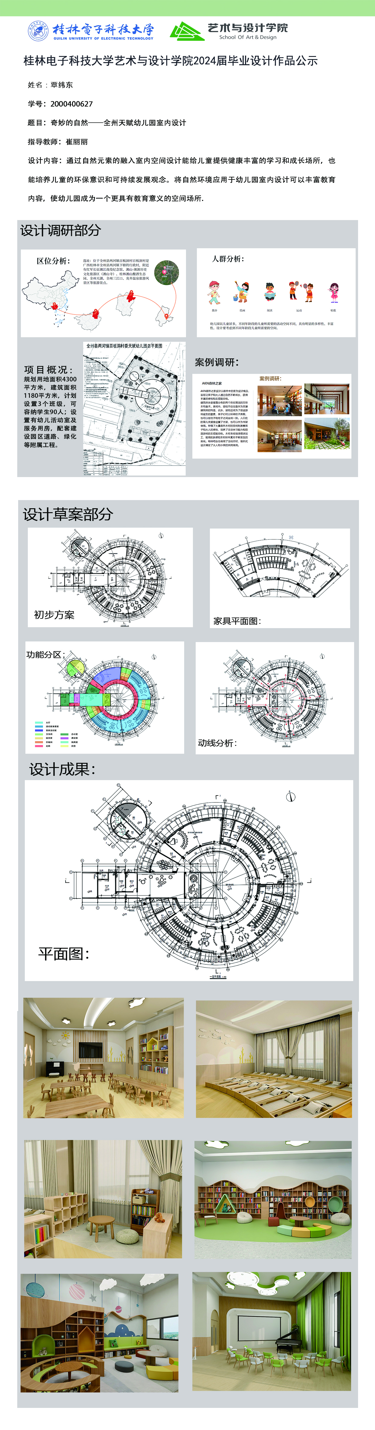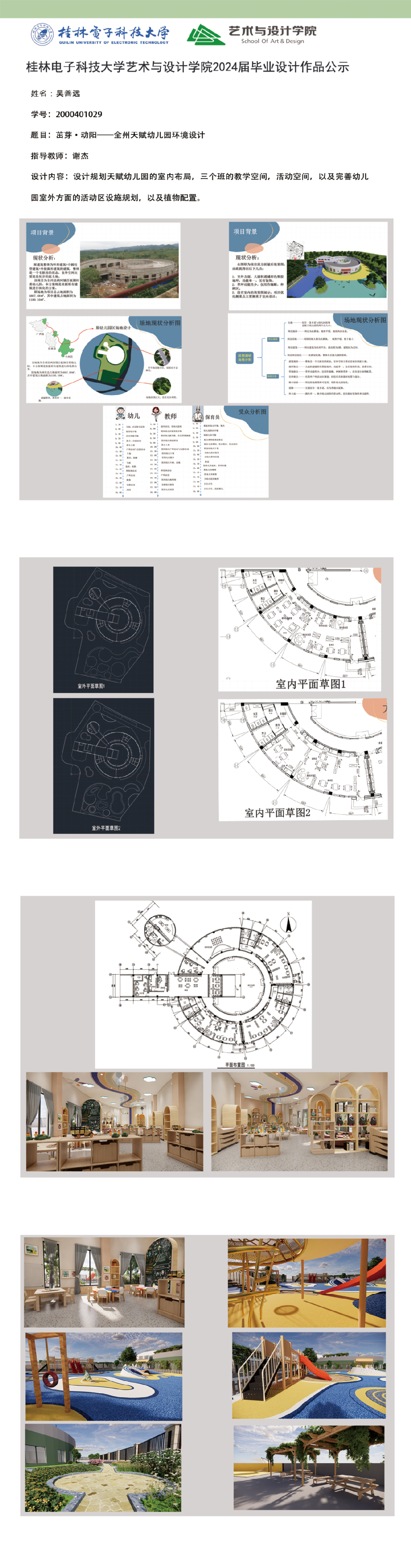 根据毕业设计管理文件规定,现将2024届环境设计专业毕业设计作品进行公示。对所公示的作品如有疑议,请实名举证。公示期为三天(2024.04.24-2024.04.26)。作品公示期间的意见反馈邮箱:19059776@qq.com,联系电话:13457651975。