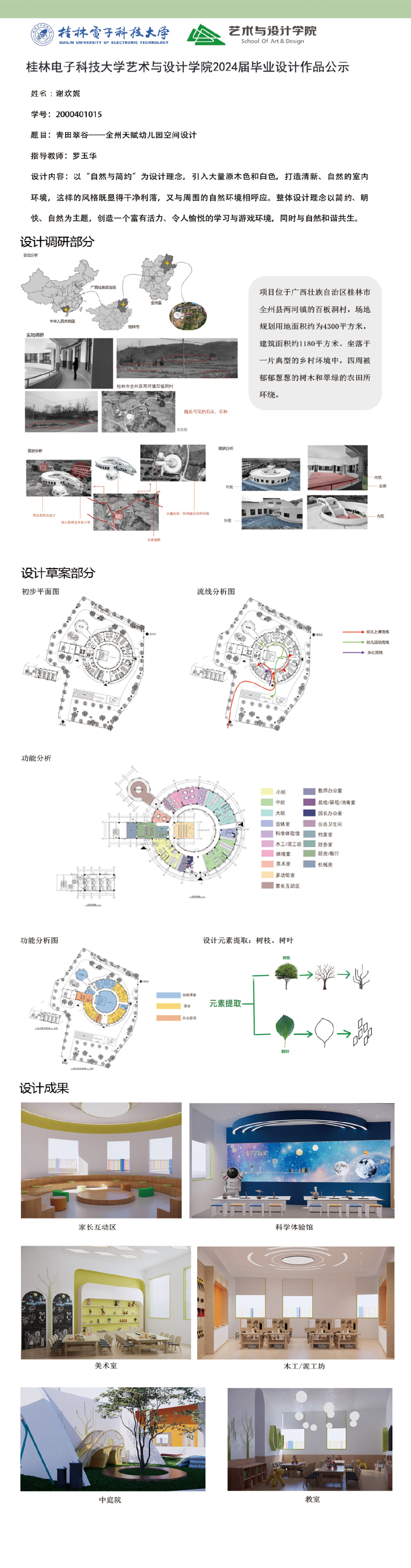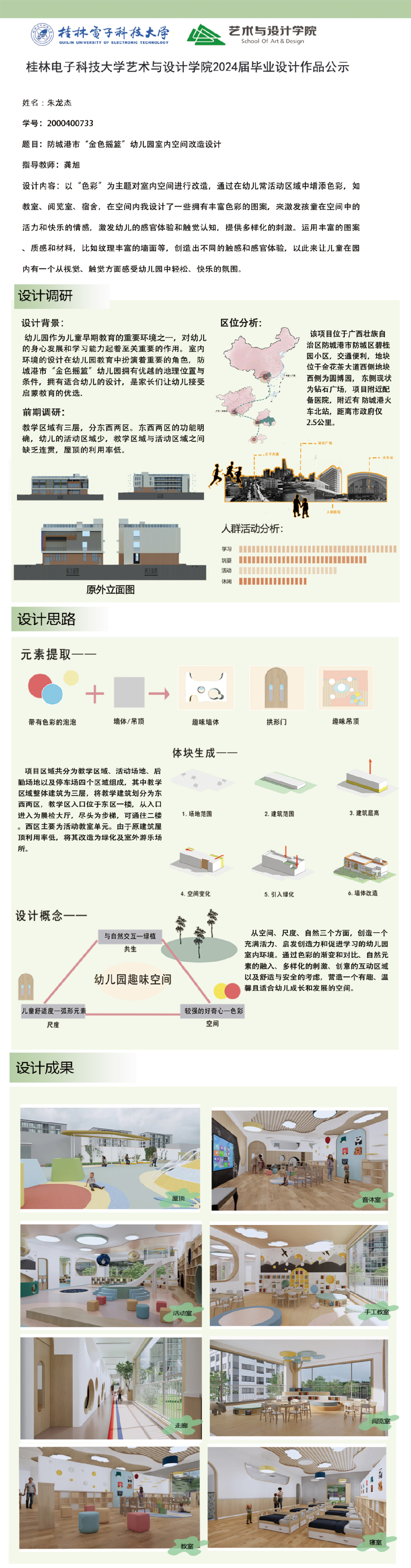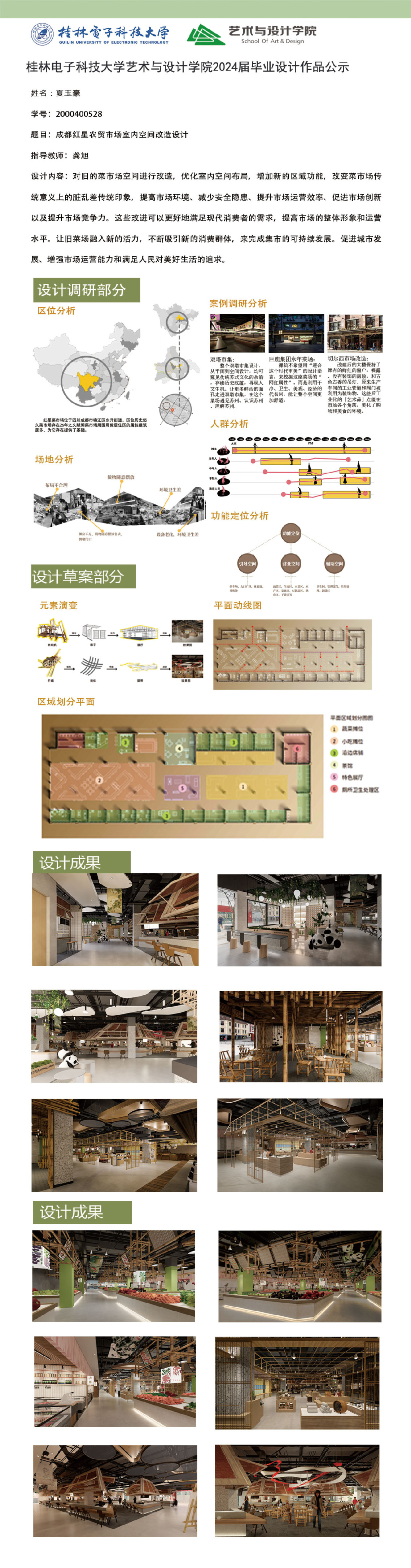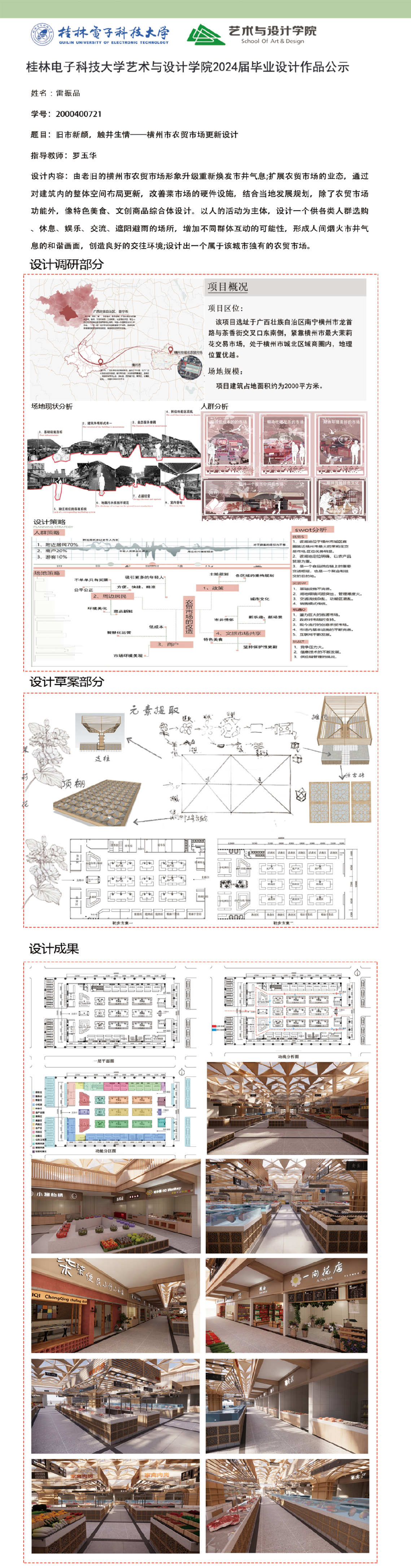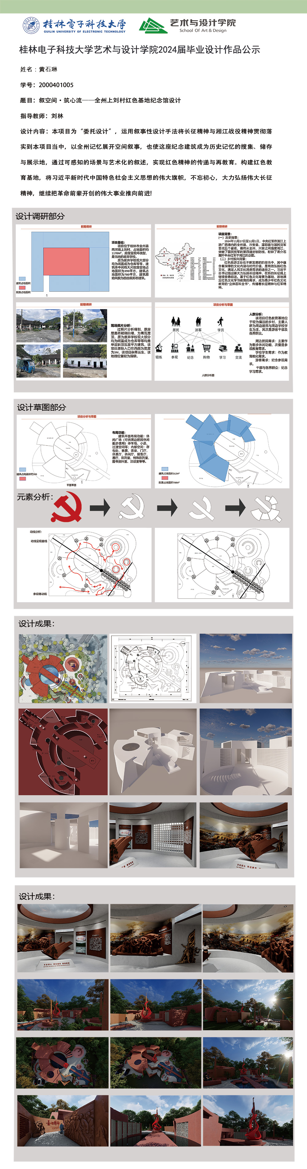 根据毕业设计管理文件规定,现将2024届环境设计专业毕业设计作品进行公示。对所公示的作品如有疑议,请实名举证。公示期为三天(2024.04.24-2024.04.26)。作品公示期间的意见反馈邮箱:19059776@qq.com,联系电话:13457651975。