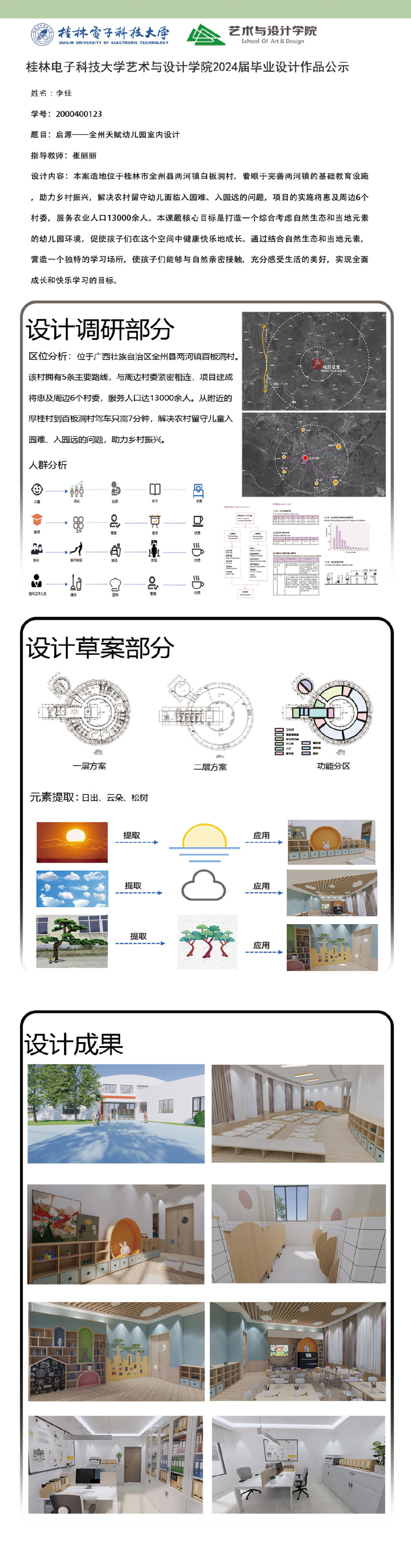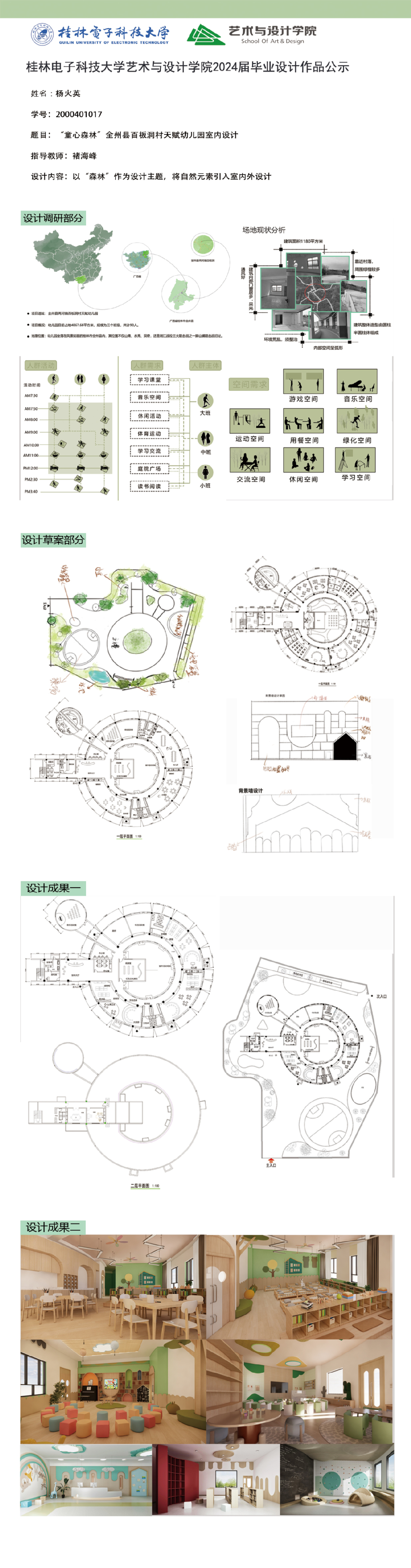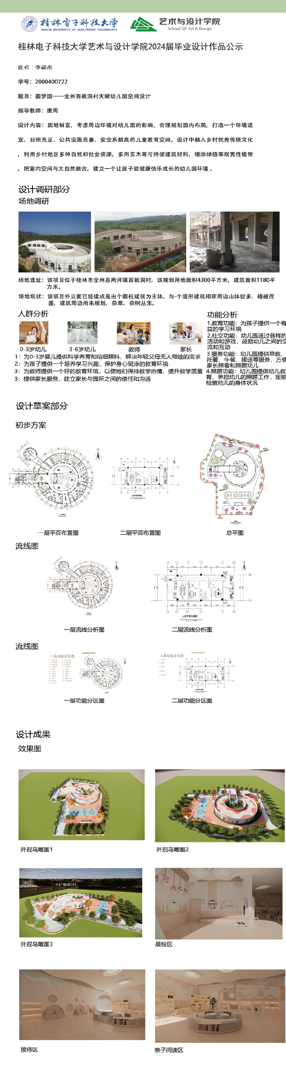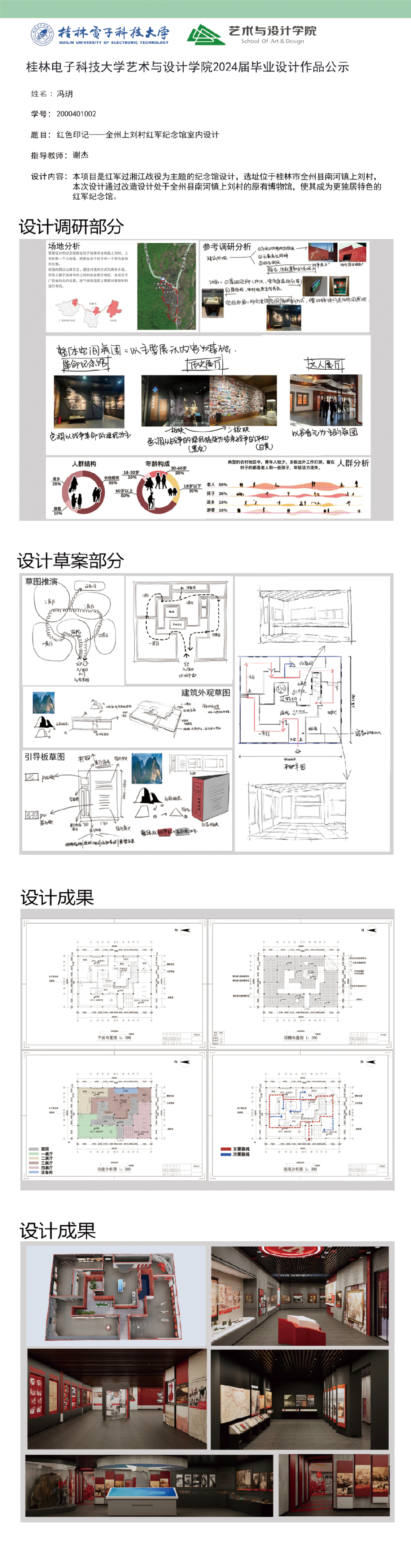 根据毕业设计管理文件规定,现将2024届环境设计专业毕业设计作品进行公示。对所公示的作品如有疑议,请实名举证。公示期为三天(2024.04.24-2024.04.26)。作品公示期间的意见反馈邮箱:19059776@qq.com,联系电话:13457651975。