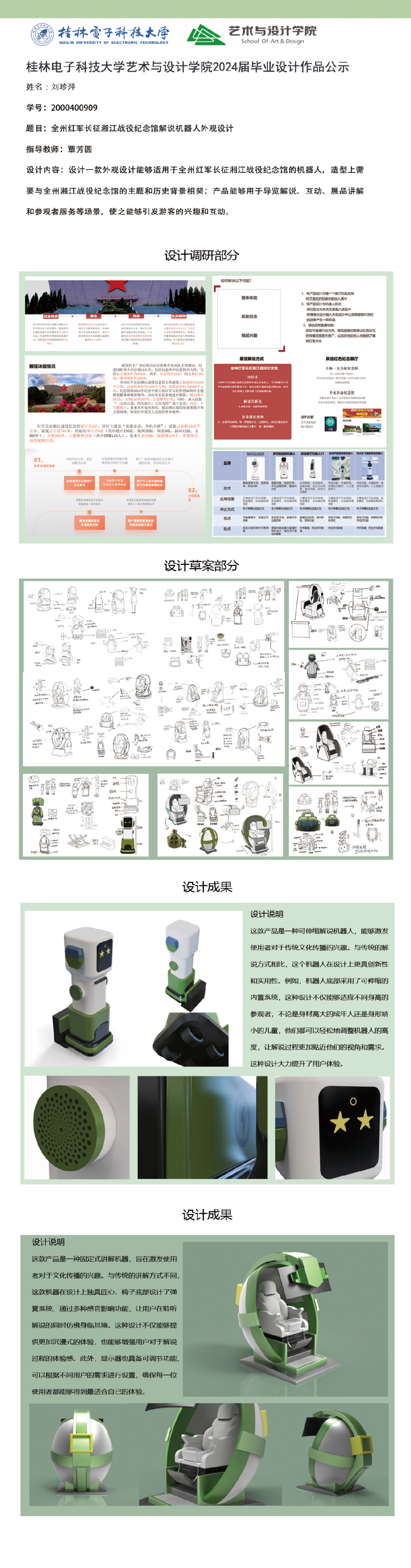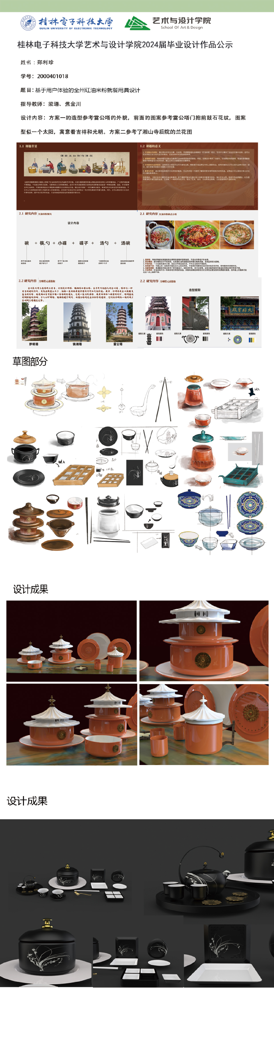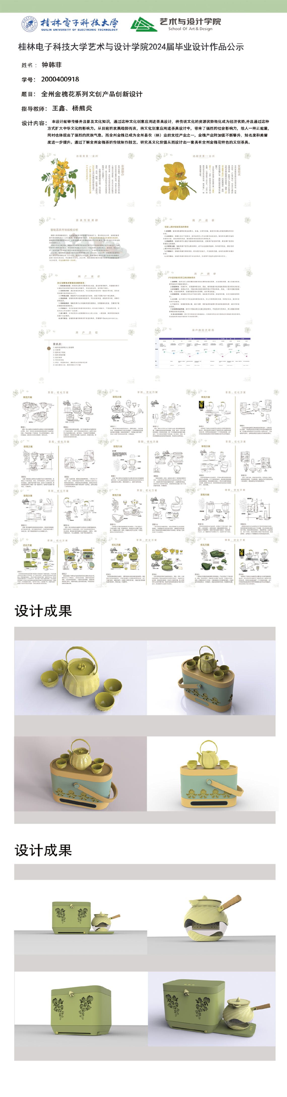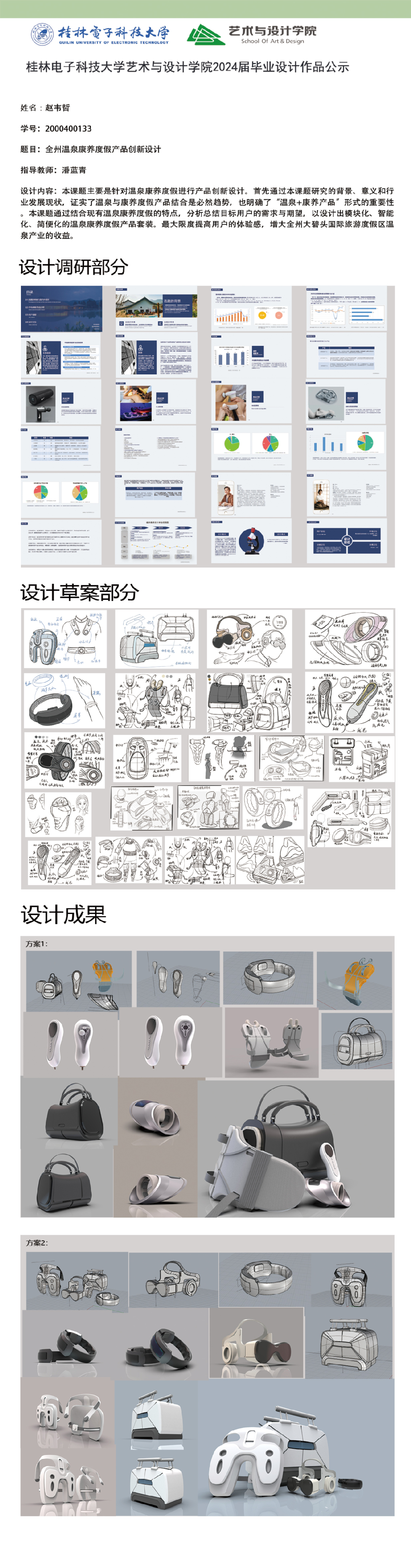根据毕业设计管理文件规定,现将2024届产品设计专业毕业设计作品进行公示。对所公示的作品如有疑议,请实名举证。公示期为三天(2024.04.25-2024.04.27)。作品公示期间的意见反馈邮箱:360758122@qq.com,联系电话:18978660487。