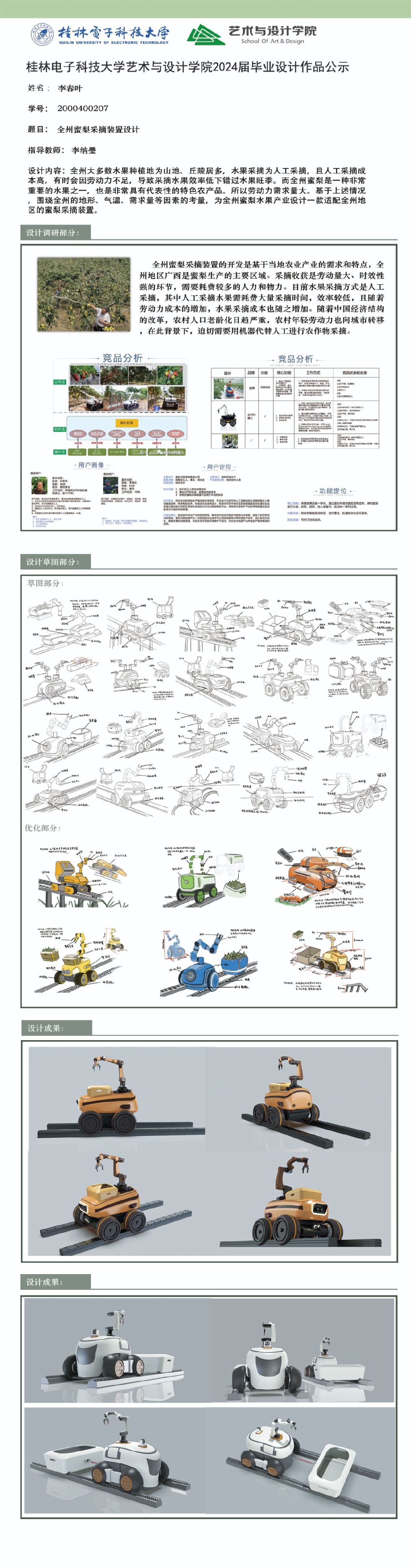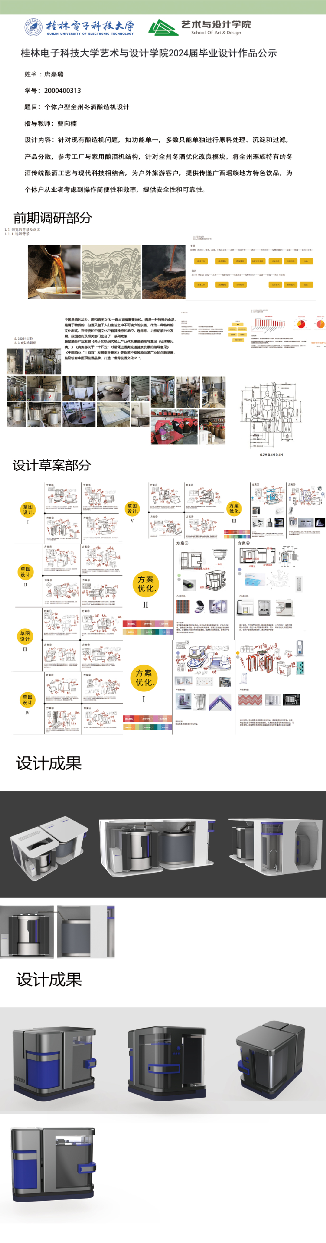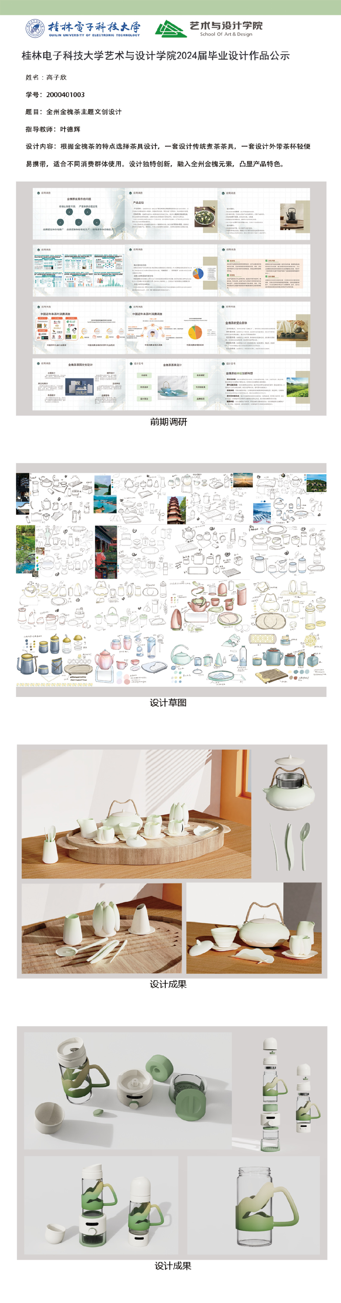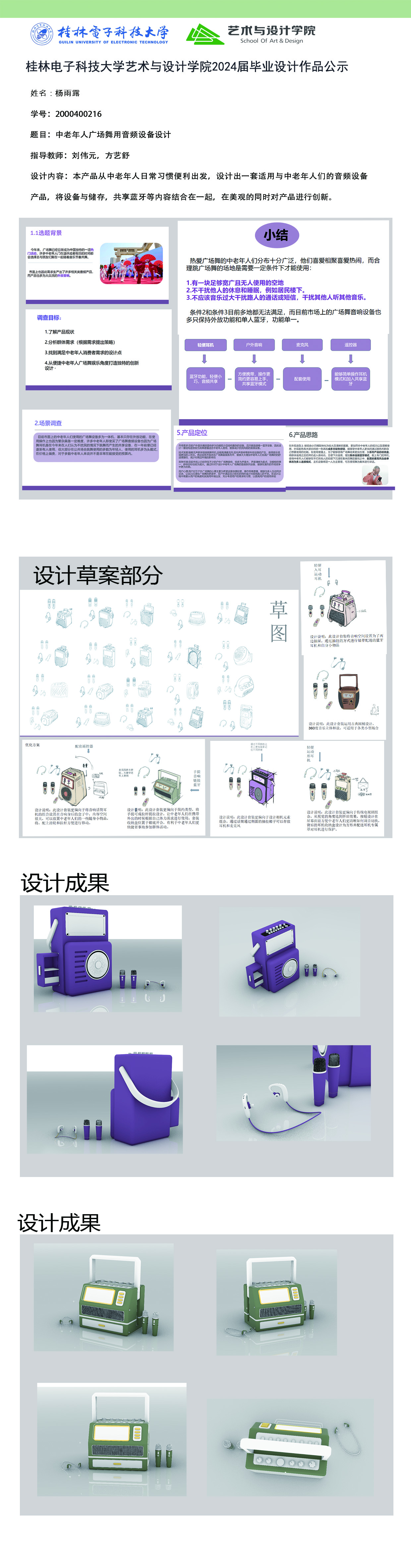 根据毕业设计管理文件规定,现将2024届产品设计专业毕业设计作品进行公示。对所公示的作品如有疑议,请实名举证。公示期为三天(2024.04.25-2024.04.27)。作品公示期间的意见反馈邮箱:360758122@qq.com,联系电话:18978660487。