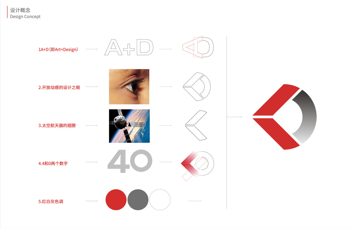 1.标识以A+D(即Art+Design)的抽象形构成立体多维、方圆融通、空间环转的D字型,本质直观的表现设计的交叉学科的属性定位。