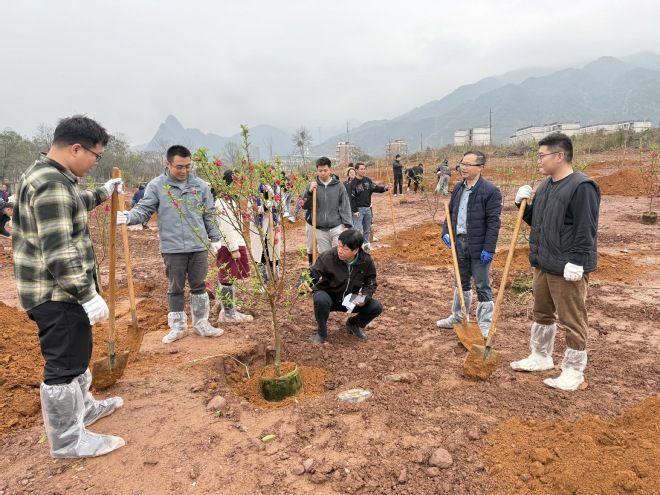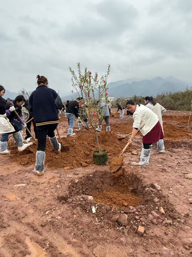 活动当天,学院院长叶德辉、党委副书记管鹏和师生代表齐聚校园内的五期B地块植树区域。大家手持铁锹、水桶等工具,热情高涨地投入到植树活动中。活动现场,大家分工明确、配合默契,有的负责扶苗,有的负责填土,每一个环节都一丝不苟。经过大家的共同努力,一株株树苗在校园内“安家落户”,为校园带来了新的生机与活力。