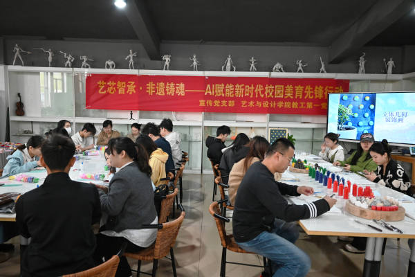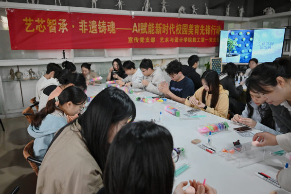 3月28日,由宣传部/融媒体中心、艺术与设计学院党委主办的艺芯智承·非遗铸魂——党建引领AI赋能新时代校园美育先锋行动在花江校区未来创客工坊开展。活动吸引了全校60余名师生参与。