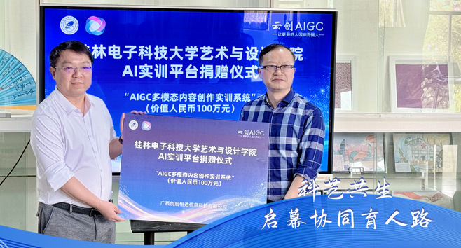 捐赠仪式上,广西创启恒达信息科技有限公司总经理田斌表示:“作为广西本土科技企业,我们期待通过技术反哺教育,与高校共建AI艺术人才培养生态。”艺术与设计学院叶德辉院长代表学院接受捐赠时表示,学院将充分利用这一实训系统,将其深度融入教学体系,助力学生提升AI应用水平,培养出更多具备创新思维和实践能力的高素质人才,为学院的教学与科研工作注入新的活力,推动学院在艺术与设计领域迈向更高的台阶。