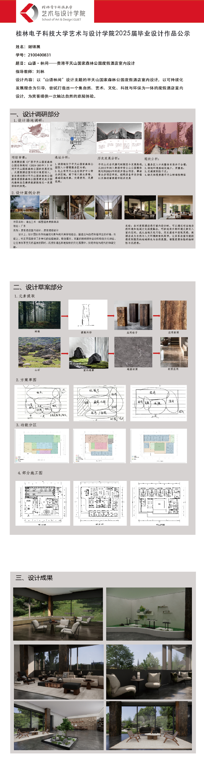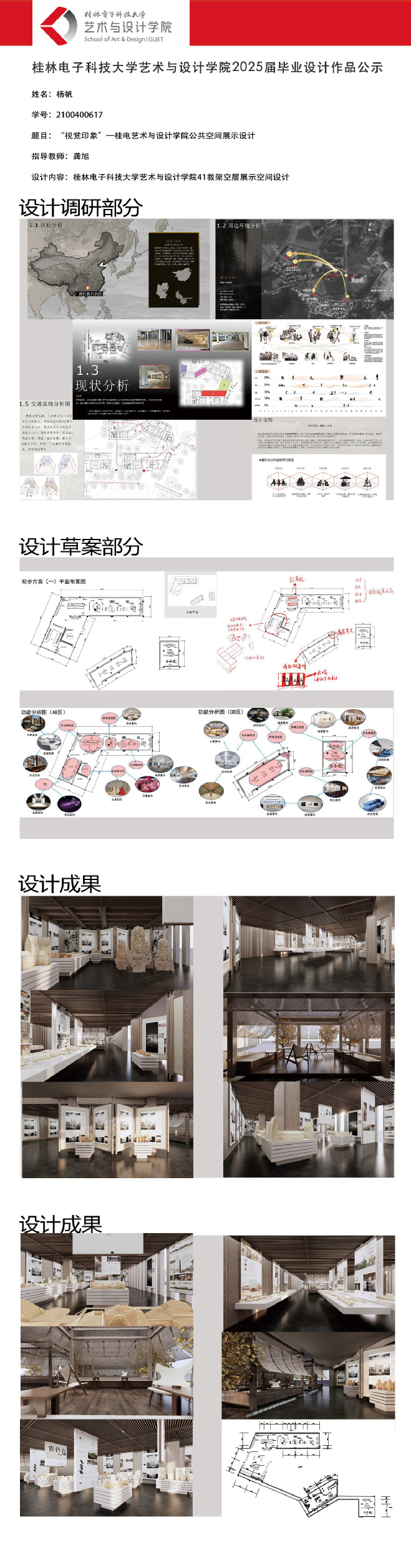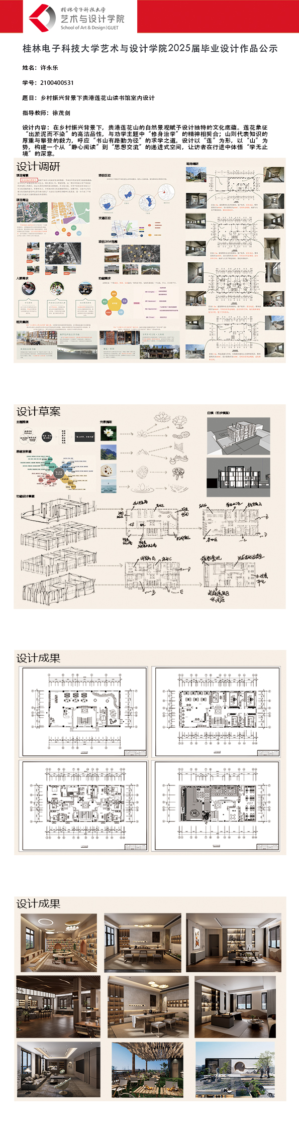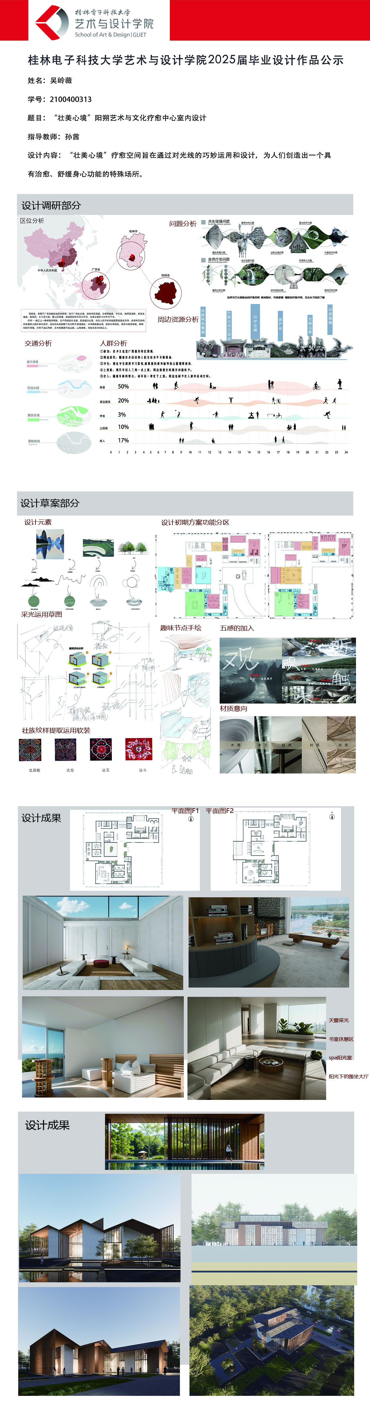 根据毕业设计管理文件规定,现将2025届环境设计专业毕业设计作品进行公示。对所公示的作品如有疑议,请实名举证。公示期为三天(2025.04.17-2025.04.19)。作品公示期间的意见反馈邮箱:19059776@qq.com,联系电话:13457651975。