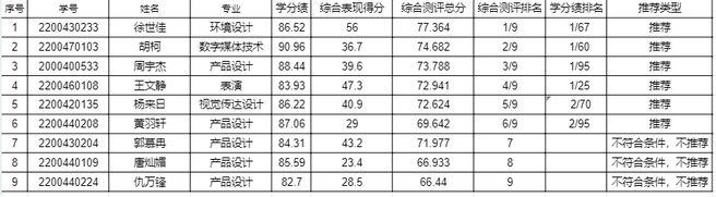 根据《三亿官方官网三亿(中国)_三亿(中国)推荐优秀应届本科毕业生免试攻读研究生工作实施办法》和《艺术与设计学院2026年推荐优秀应届本科毕业生免试攻读研究生工作实施办法》(艺设字﹝2025﹞23号)文件的要求,经学生个人申请,学院推免工作领导小组和材料审核专家组审核,现将综合测评结果公示如下: