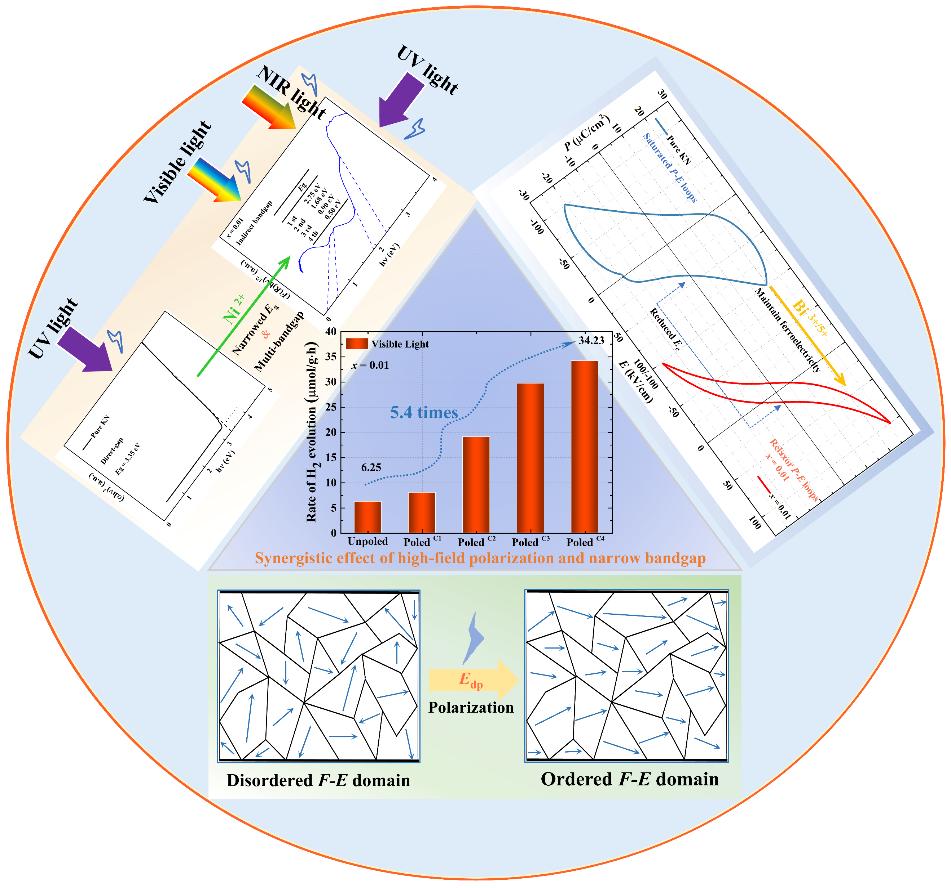 本论文通过Ba、Ni、Bi共掺杂策略,制备了一系列具有窄带隙和高场极化能力的KNbO3基铁电半导体光催化材料。高场极化诱导的去极化电场(Edp)有效增强了样品的可见光催化析氢能力,最高析氢速率是未极化样品的5.4倍。光催化析氢速率的提高主要是由于带隙的显著减小和高场极化诱导Edp的协同效应。极化样品中能带结构的变化进一步揭示了高场极化可以通过能带弯曲来加速载流子的迁移。深入了解高场强极化诱导Edp增强光催化活性的机理,可为钙钛矿氧化物铁电光催化材料在可见光催化领域的进一步发展提供了新思路。