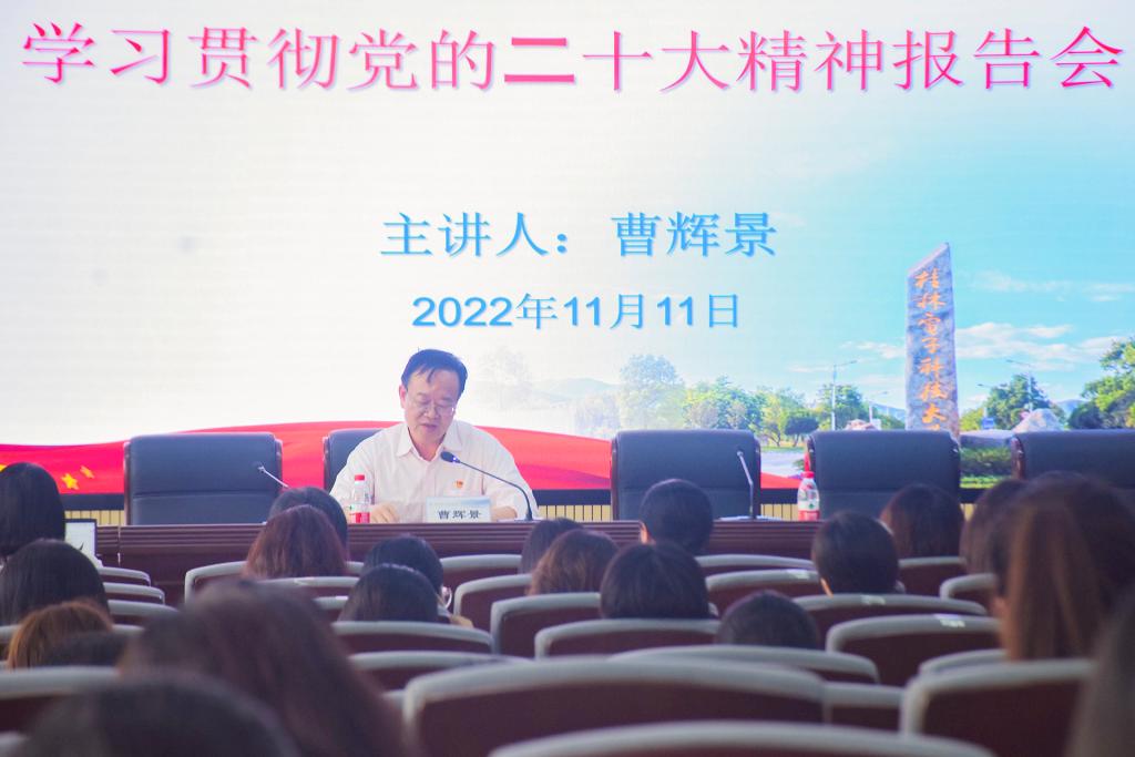 报告会上,曹辉景从党的二十大的主题及主要成果、过去5年的工作和新时代10年的伟大变革、马克思主义中国化时代化等方面进行了宣讲,重点阐释了党的二十大报告中关于教育、科技、人才“三位一体”部署的战略意义和深远影响,为学院教职工进一步学懂弄通做实党的二十大精神提供了重要的指导。他强调,学习宣传贯彻党的二十大精神是当前和今后一个时期我们的首要政治任务,学院全体教职工要坚持学思践悟,准确把握党的二十大精神的核心要义和思想精髓,切实把学习成效转化为推动学院各项工作高质量发展的强大动力。