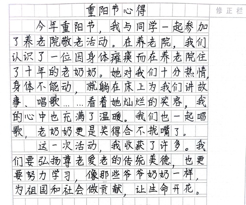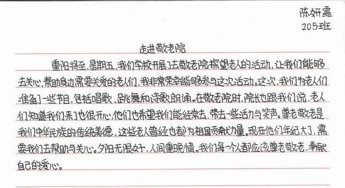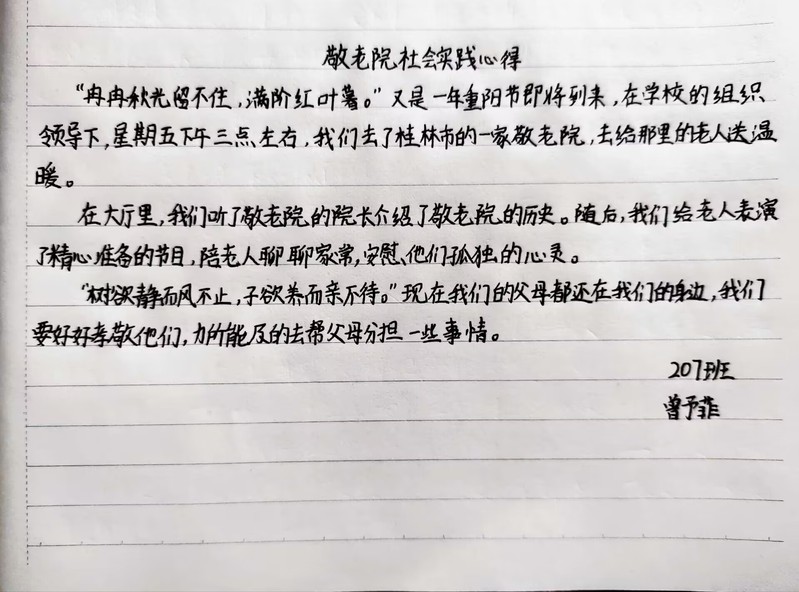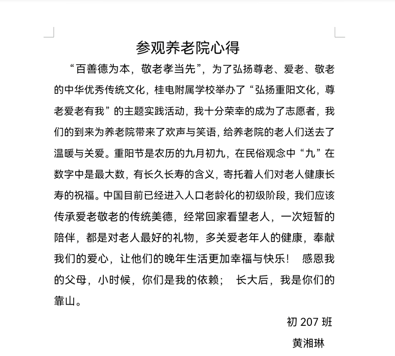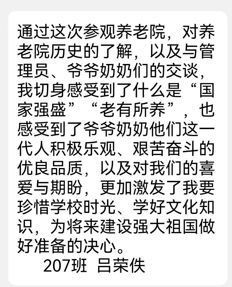 此次主题教育活动,激发了桂电附校学生敬老爱亲的内在自觉,老吾老以及人之老,由重阳尊老爱亲推及爱师长、爱学校、爱社会、爱国家,进一步树立社会责任感和使命感。