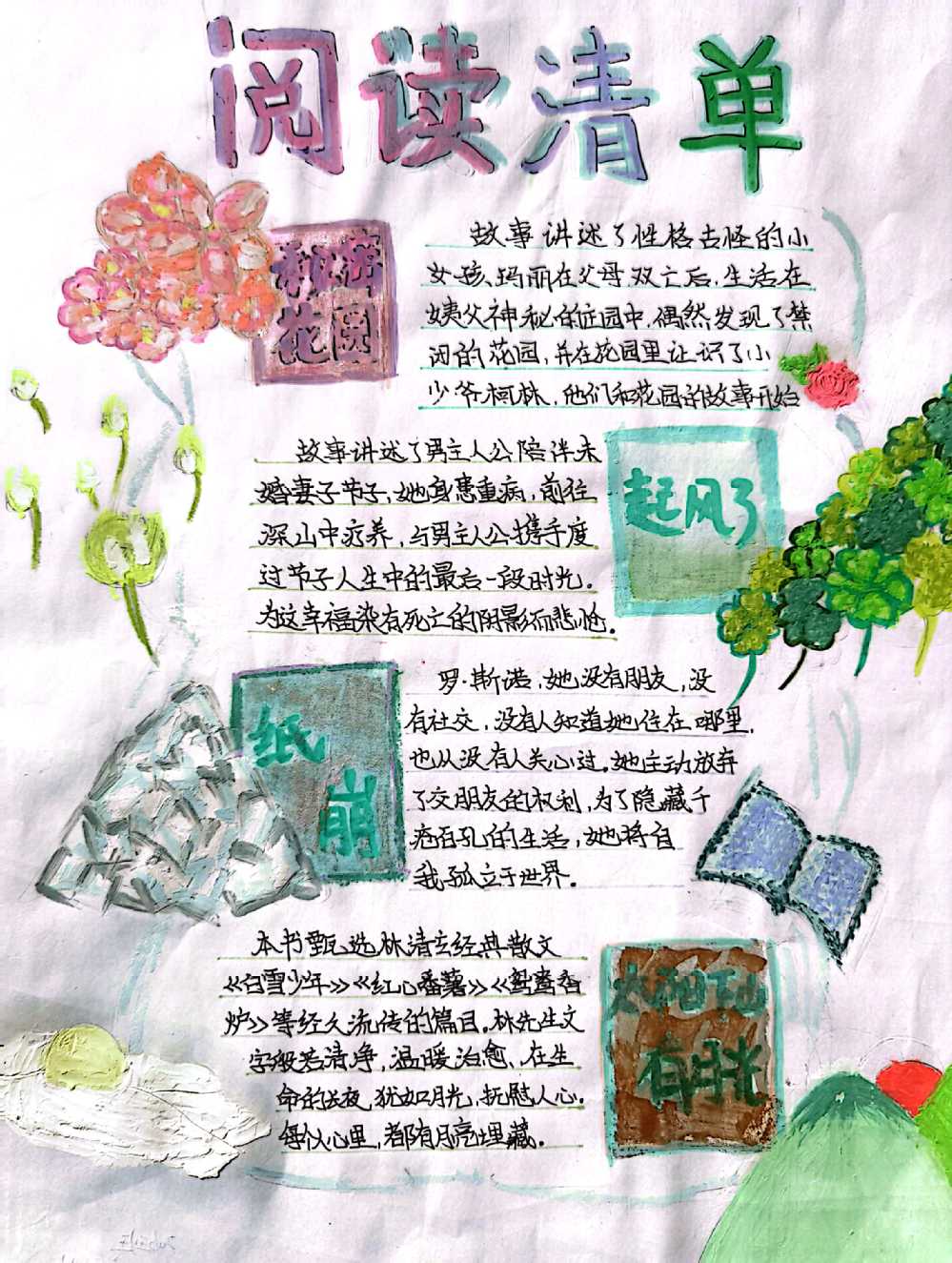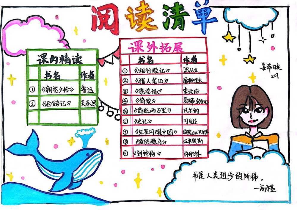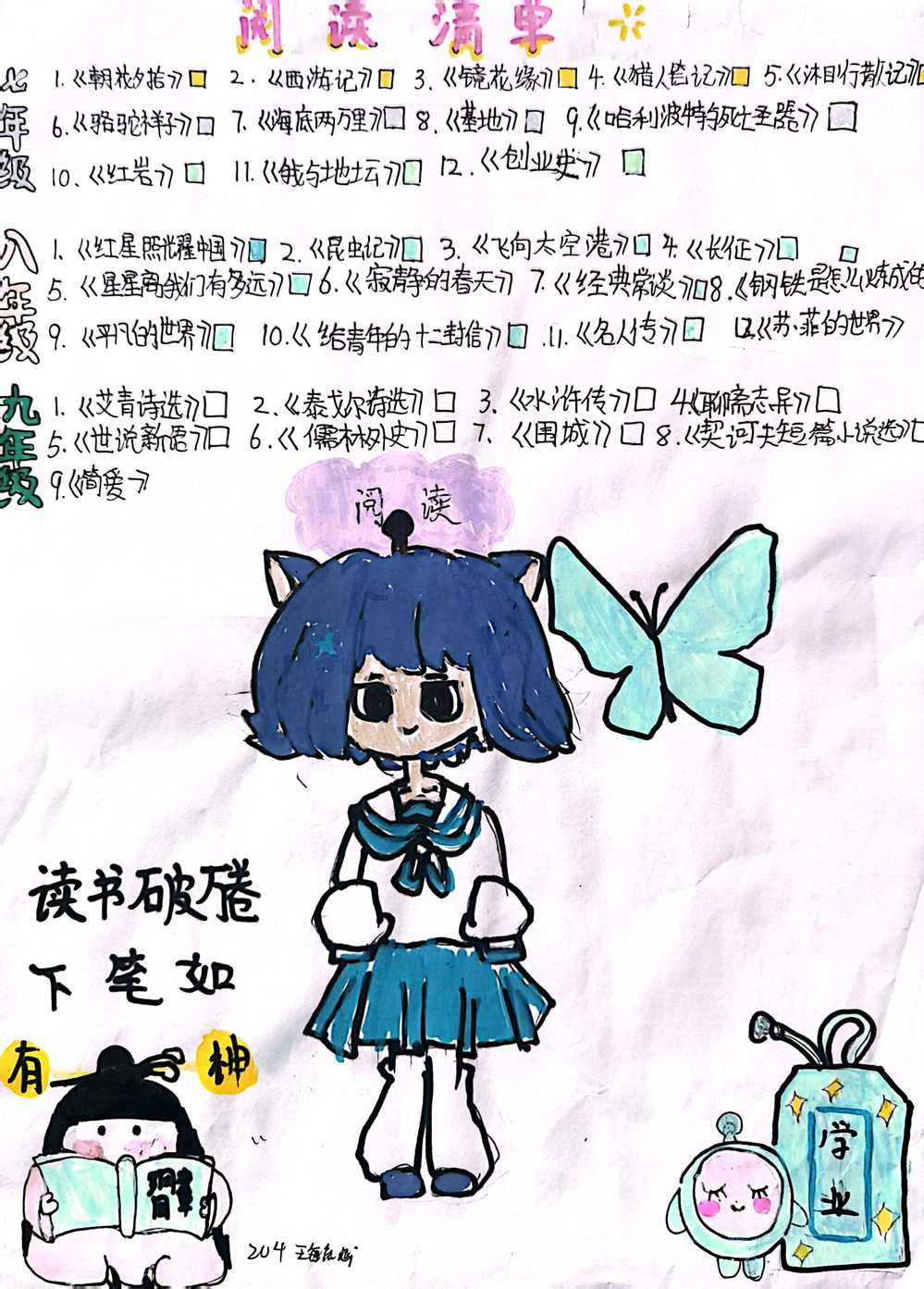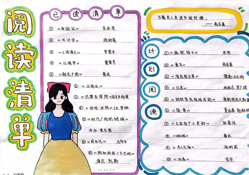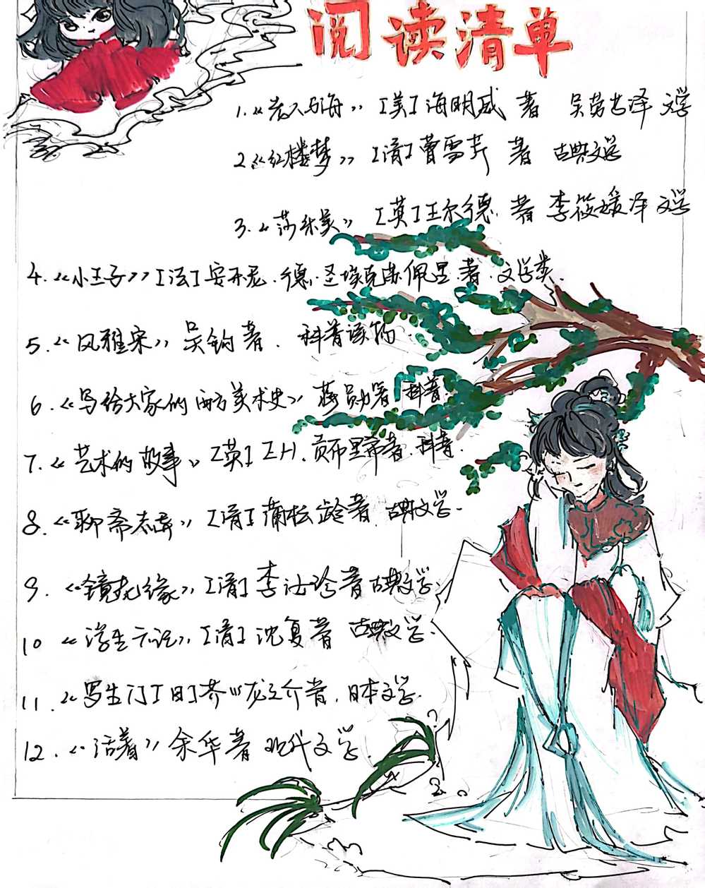 一张张精美的设计清单,一幅幅别出心裁的图片,学生们用简洁的文字,斑斓的色彩表达出对名著的理解,对作者的敬佩,对经典的致敬。此次阅读书目涉及面广,包括文学、人文社科、自然科学及艺术等方面,学生们积极参与,热情高涨,或手绘或电脑设计,在提高学生阅读品味的同时,丰富了学生的精神世界。