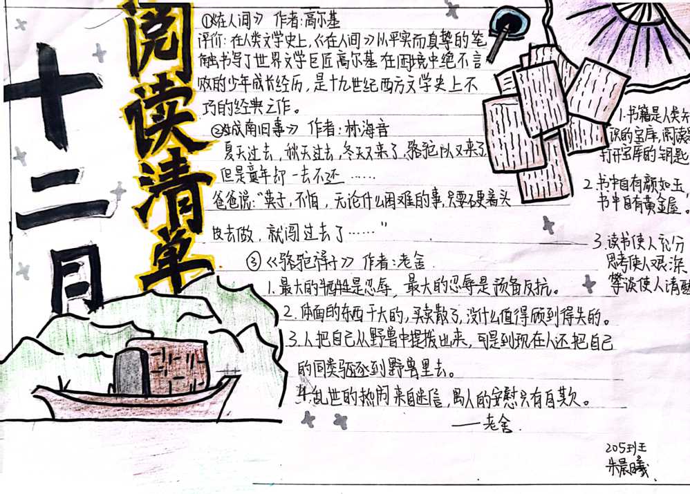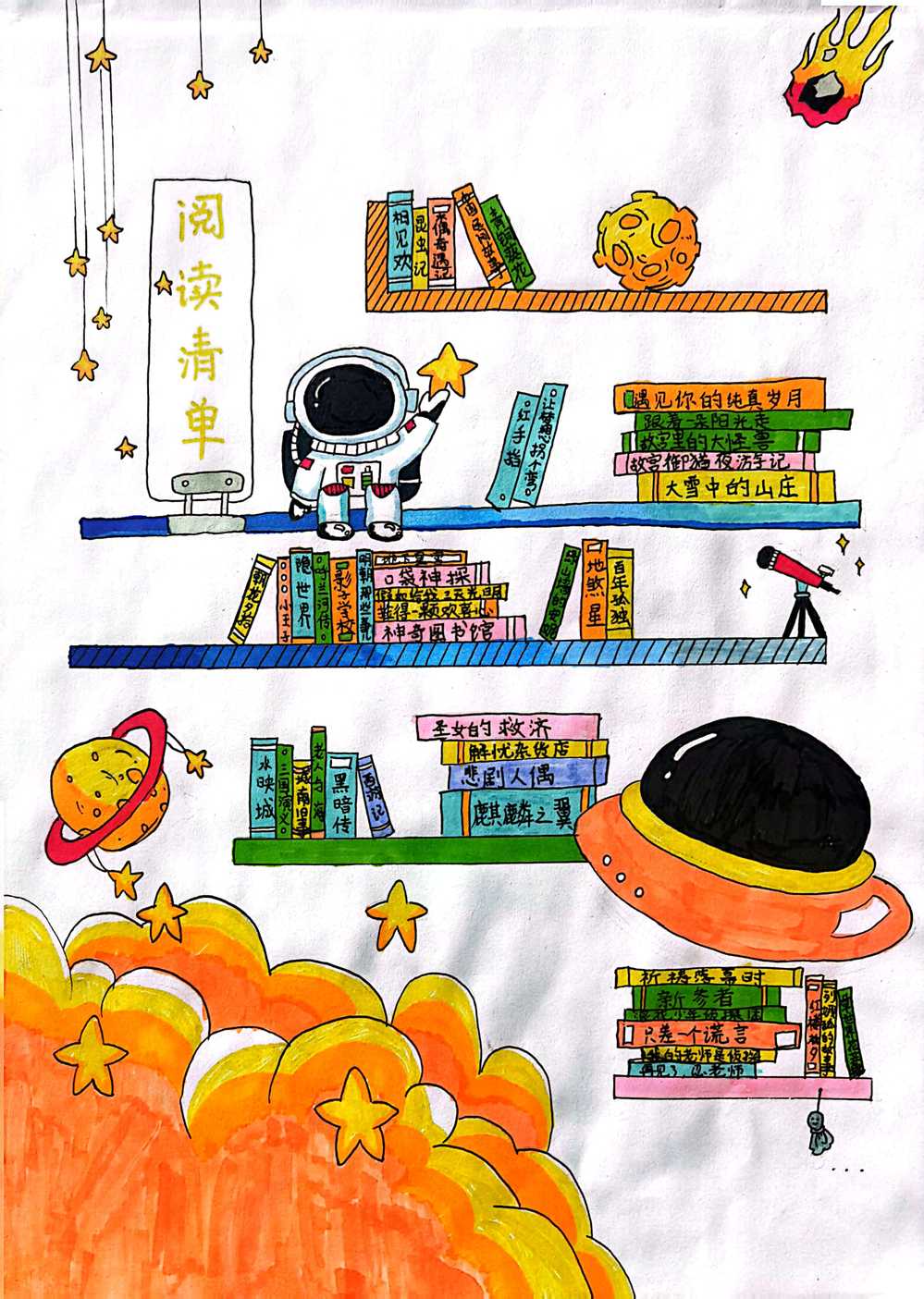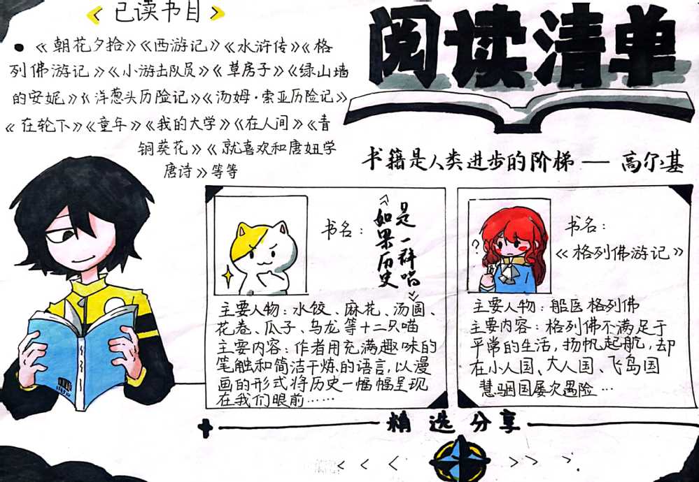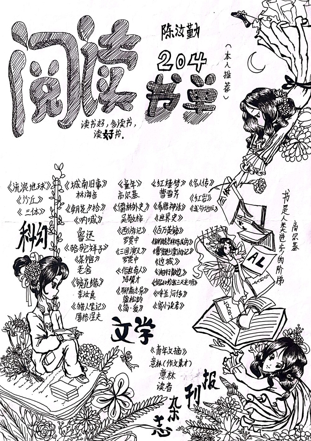 一张张精美的设计清单,一幅幅别出心裁的图片,学生们用简洁的文字,斑斓的色彩表达出对名著的理解,对作者的敬佩,对经典的致敬。此次阅读书目涉及面广,包括文学、人文社科、自然科学及艺术等方面,学生们积极参与,热情高涨,或手绘或电脑设计,在提高学生阅读品味的同时,丰富了学生的精神世界。