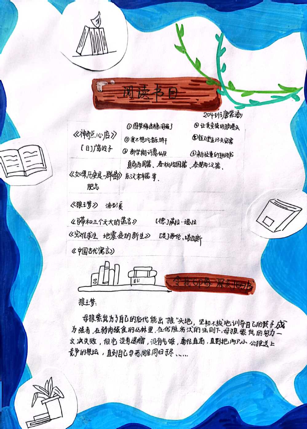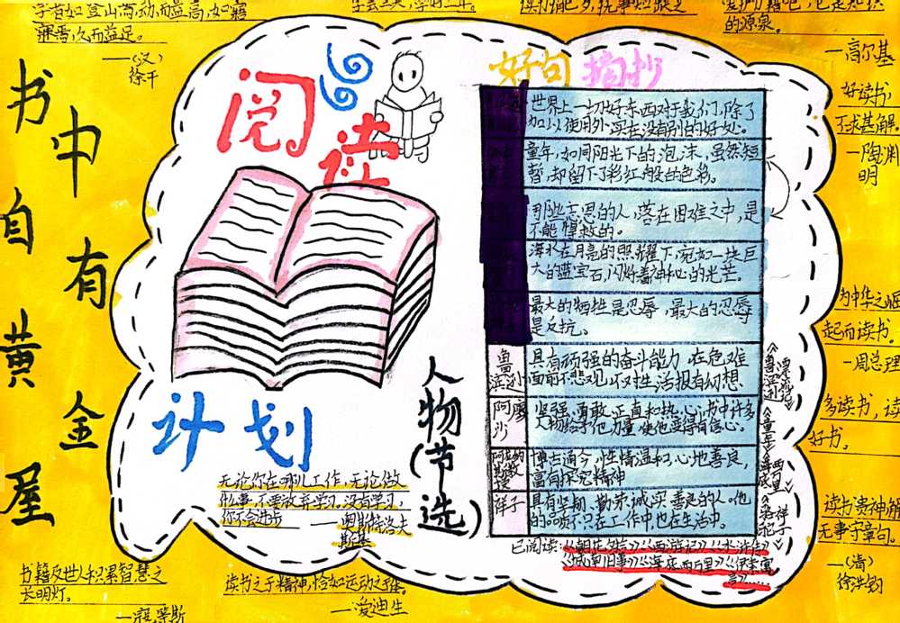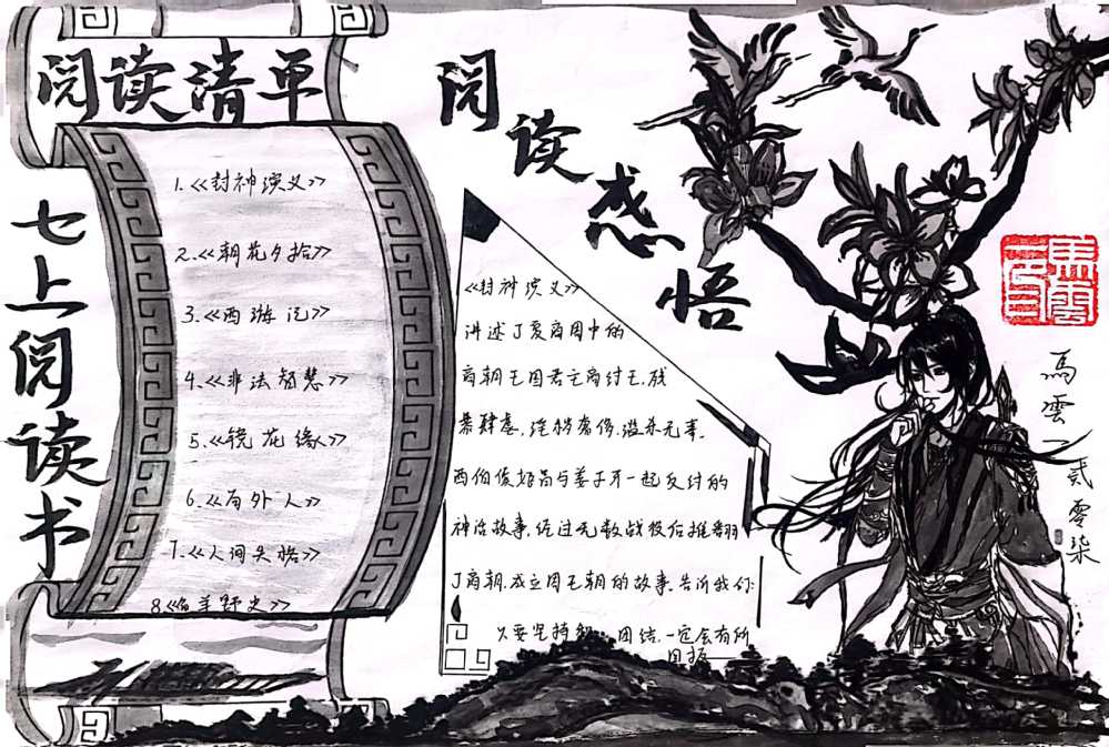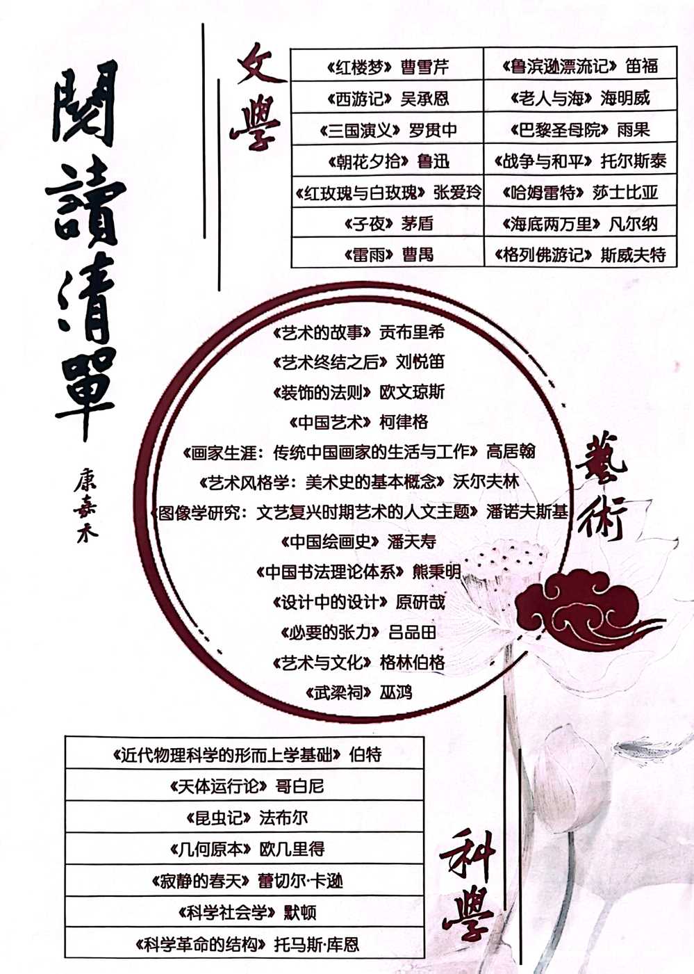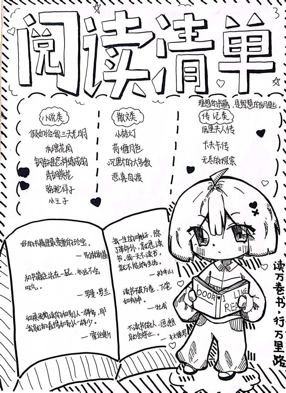 一张张精美的设计清单,一幅幅别出心裁的图片,学生们用简洁的文字,斑斓的色彩表达出对名著的理解,对作者的敬佩,对经典的致敬。此次阅读书目涉及面广,包括文学、人文社科、自然科学及艺术等方面,学生们积极参与,热情高涨,或手绘或电脑设计,在提高学生阅读品味的同时,丰富了学生的精神世界。