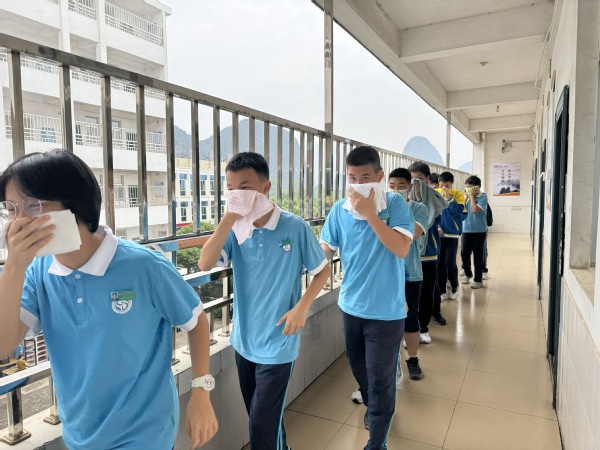 面对火灾信号,同学们反应迅速,及时用湿毛巾等遮掩口鼻并俯身快速逃离火灾现场,整场演习井然有序。