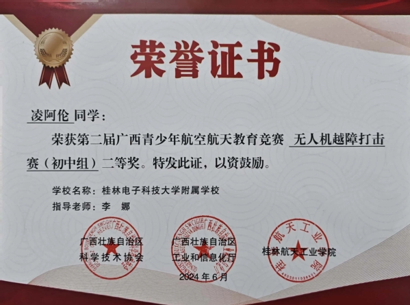 热烈祝贺205班凌阿伦同学在第二届广西青少年航空航天教育竞赛中,获无人机越障打击赛(初中组)二等奖第一名。