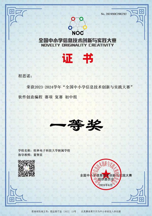 热烈祝贺204班程思诺在“全国中小学信息技术创新与实践大赛”初中组中获得一等奖!