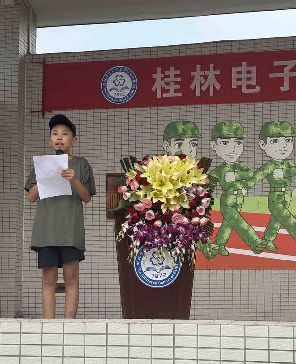 初212班的戴子淇同学代表全体参训学生回顾了6天丰富多彩的军训生活,他分享了军训的点点滴滴。他感谢教官的辛勤付出,感谢老师的陪伴与鼓励,同时也表示将把军训中培养的优良品质带到今后的学习生活中,并呼吁全体2024级新生刻苦学习,努力拼搏进取,成为品德高尚、素质全面的新一代桂电附属学校学子。