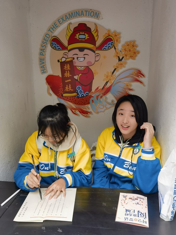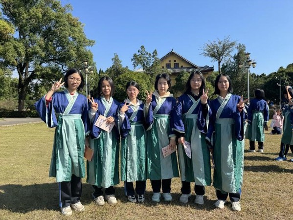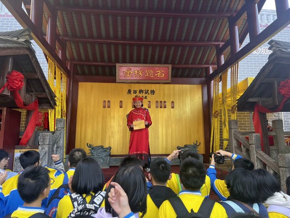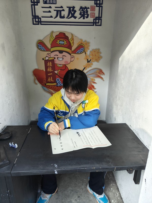 随后,同学们来到了独秀峰·王城,“未若独秀者,峨峨郛邑间。”正是对独秀峰美景的真情描绘。在这里,大家陆续参与穿学子服、拓印“福”字、学习礼仪、投壶等活动,在实景文化中深入了解中国历史,感受历史文明的前进。其中最令同学们印象深刻的当属参观贡院。广西贡院是广西学子一显身手、展示才华的窗口,是广西学子入仕为官、施展抱负的龙门。当同学们进入“考场”,亲自体验科举时,众多学子寒窗苦读的身影在大家的脑海中浮现,不断激励着初二的同学们,调动了大家对学习的积极性。
