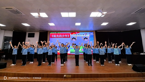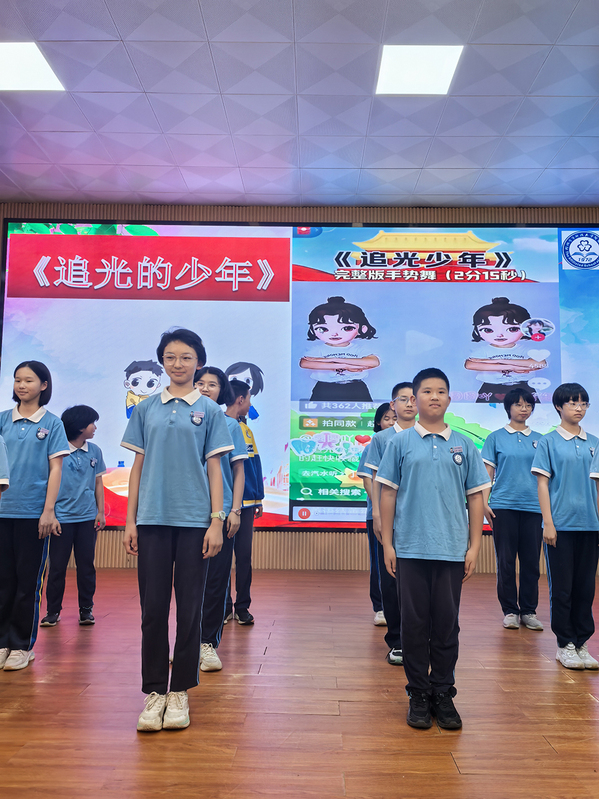 活动最后,同学们在《成长纪念卡》上写下初中目标,这些稚嫩而坚定的字迹,将封存至毕业时刻,等待未来的自己开启。全场齐唱《追光的少年》、齐做手势舞,用歌声和律动表达 “以光为引,逐梦前行” 的信念。