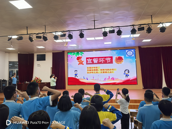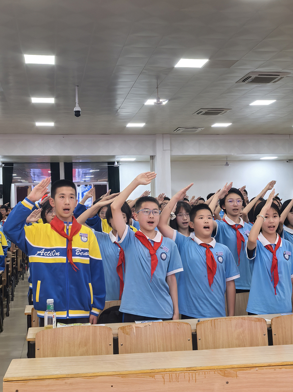 年级组长冯慧带领全体学生宣读退队誓言:“告别少先队,争做有理想、有担当的少年;以少年之名,立青春之志!” 铿锵誓言响彻会场,彰显少年们的成长决心。